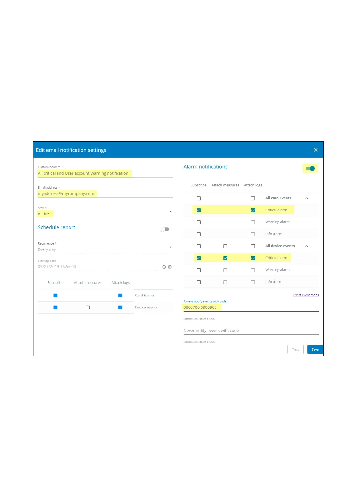 Notify on events: Active