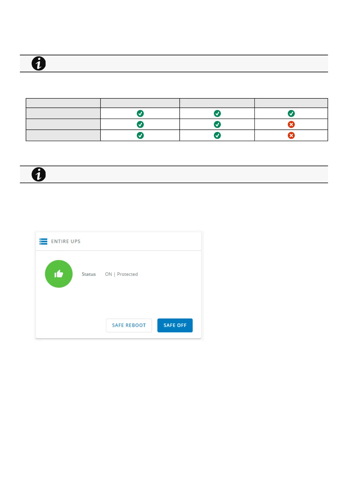 The table in this section displays UPS status, the associated commands (on/off), and the pending action.
