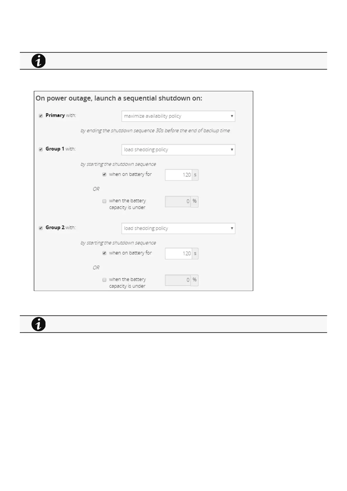 Shutdown criteria are set per power source (outlet groups) if they are present in the UPS.