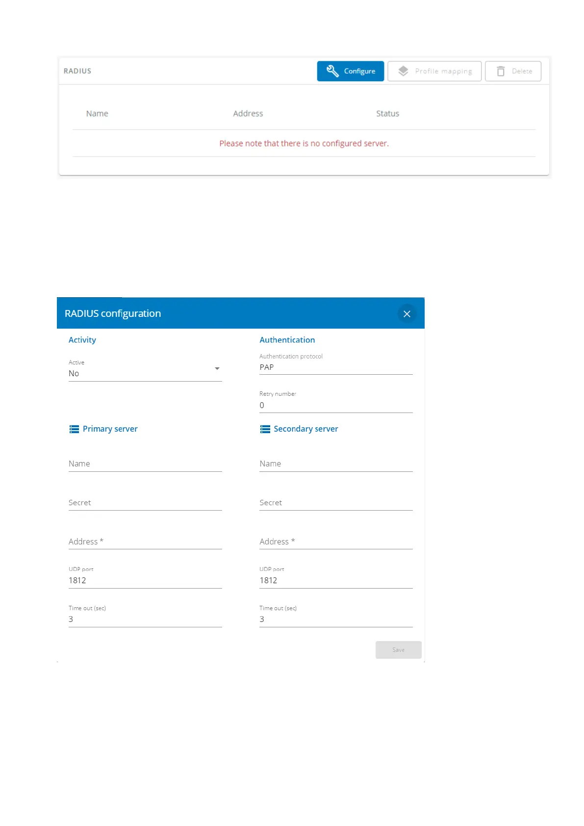 Press Configureto access the following RADIUS settings: