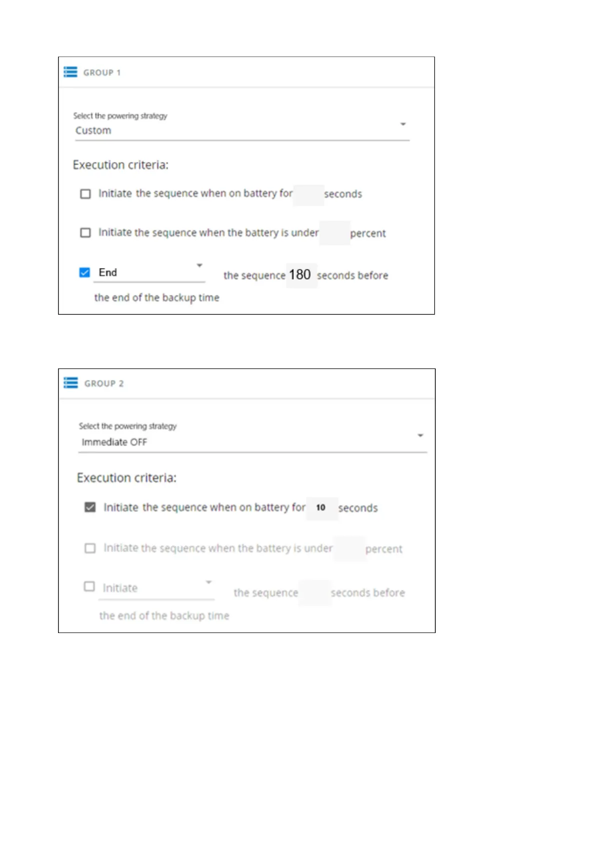 Non-priority equipmentimmediately shuts down when on battery for 10s to keep battery power for critical equipment.