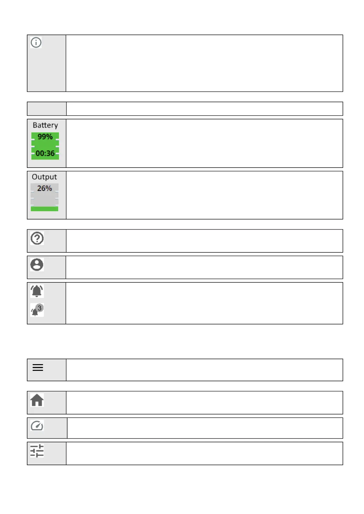 Displays the battery level (in %) and the remaining backup time.