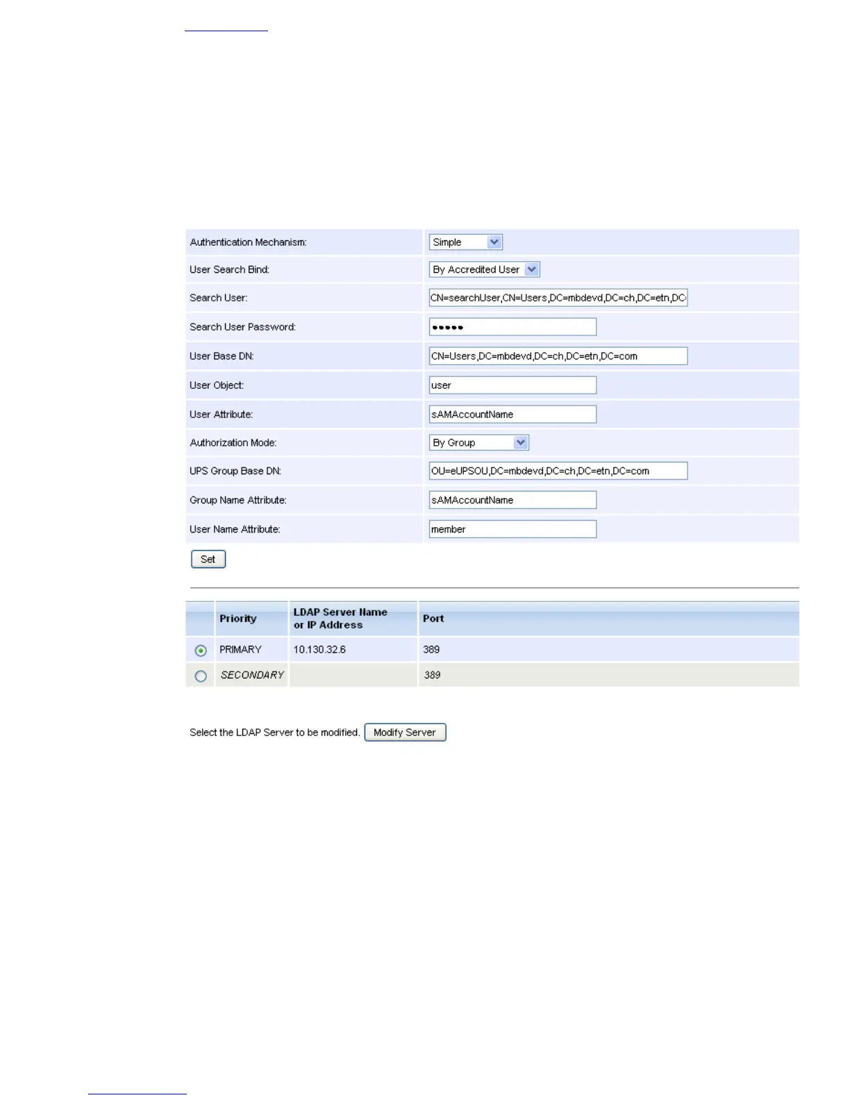 The following LDAP configuration must be apply(value of the masked field “Search User Password”: eaton):