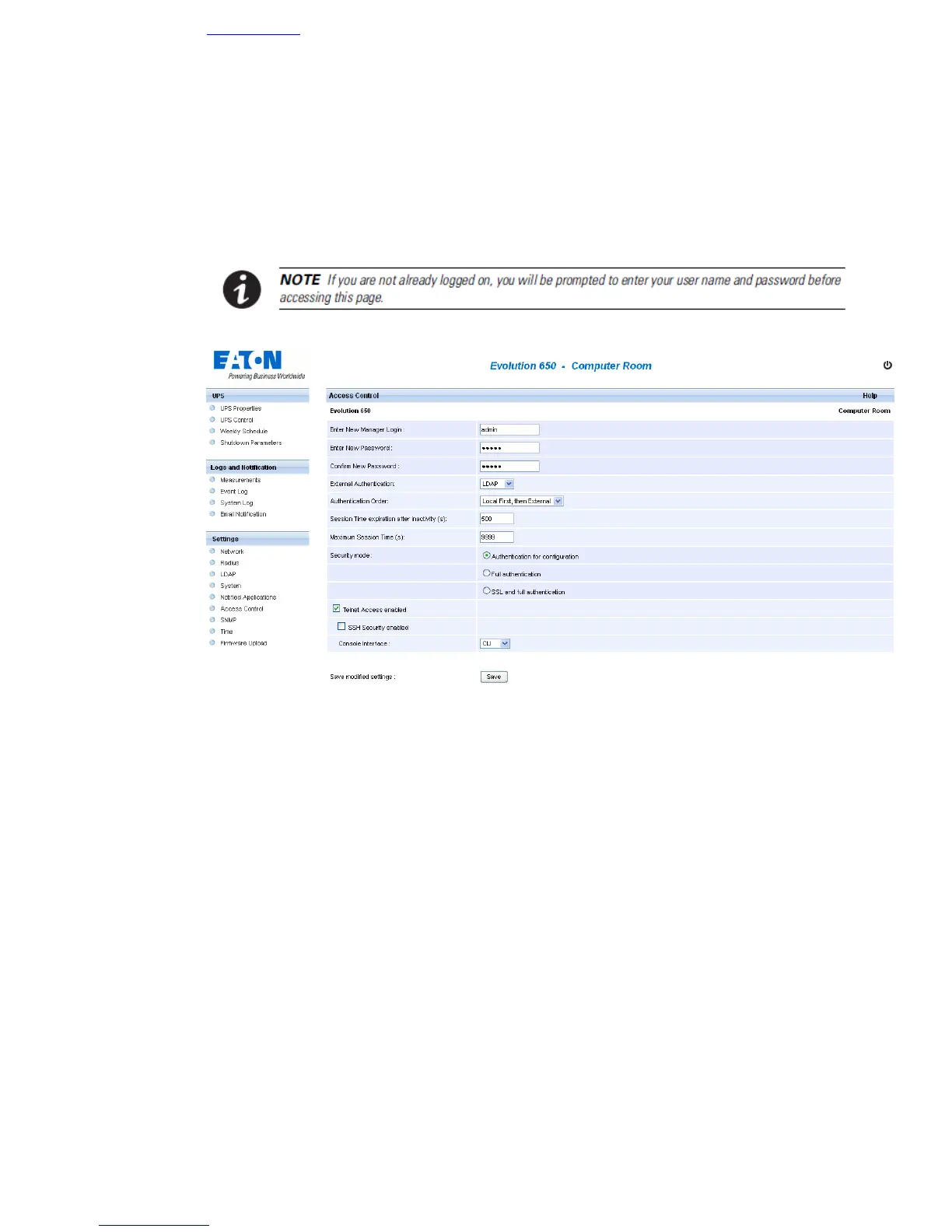 • Enter New Password: This text field (limited to thirty characters) enables secure access to