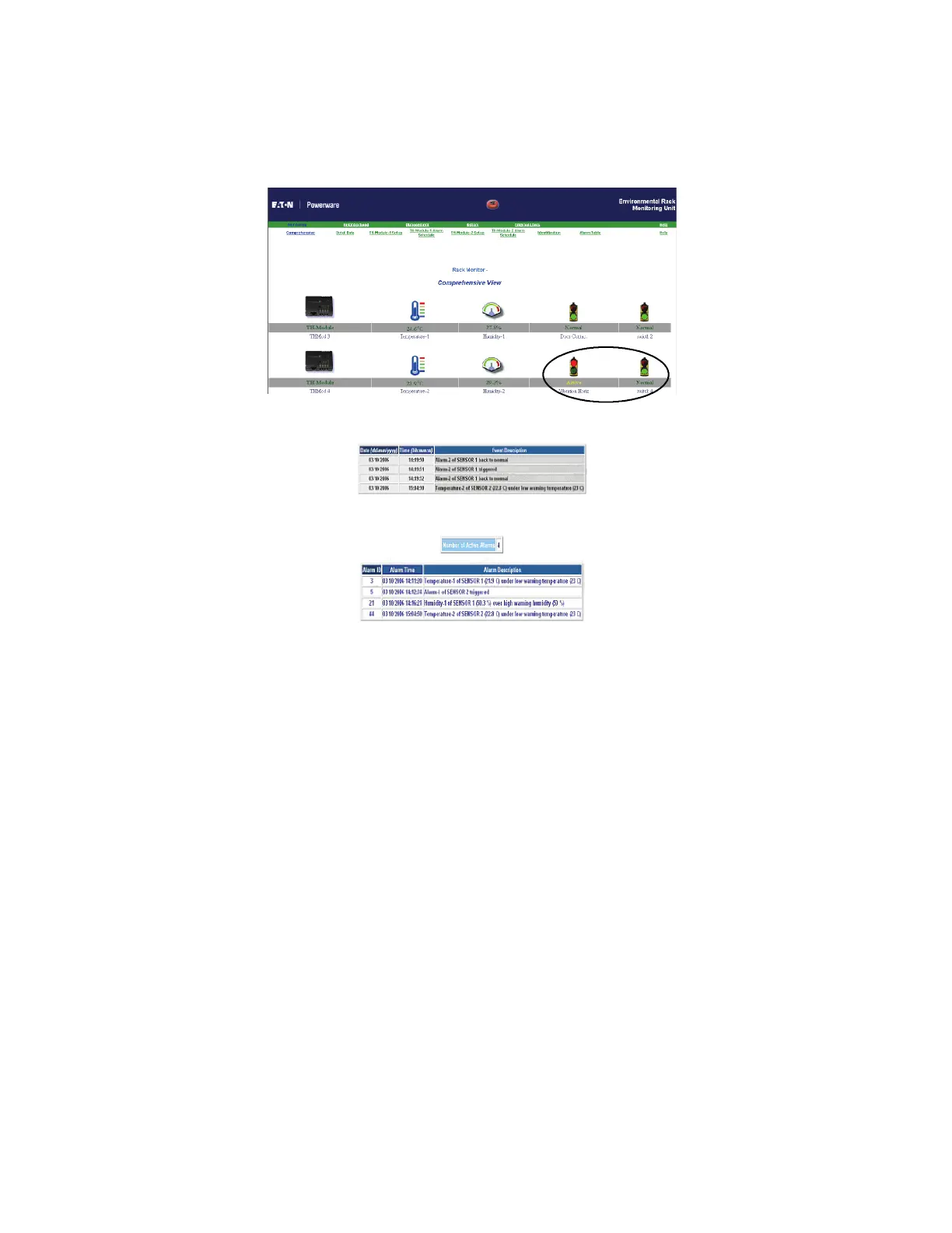 alarm. The Web page for the alarm table and sensor events also