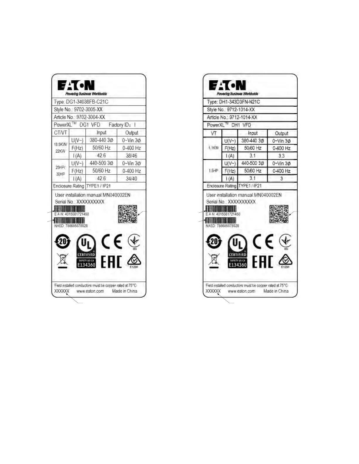 Eaton PowerXL Series - Rating Label; General Information; Figure 2. Rating Label (DG1); Figure 3. Rating Label (DH1)