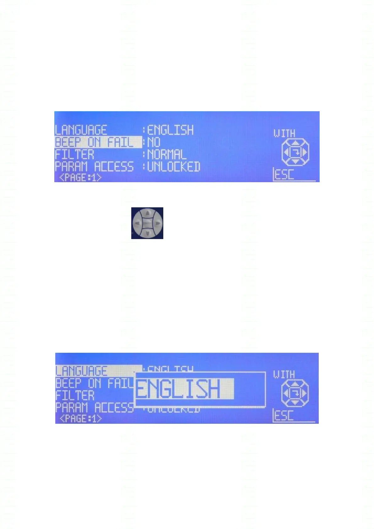 German, and Spanish). Display the required language with the UP/DOWN arrows, and then enter.