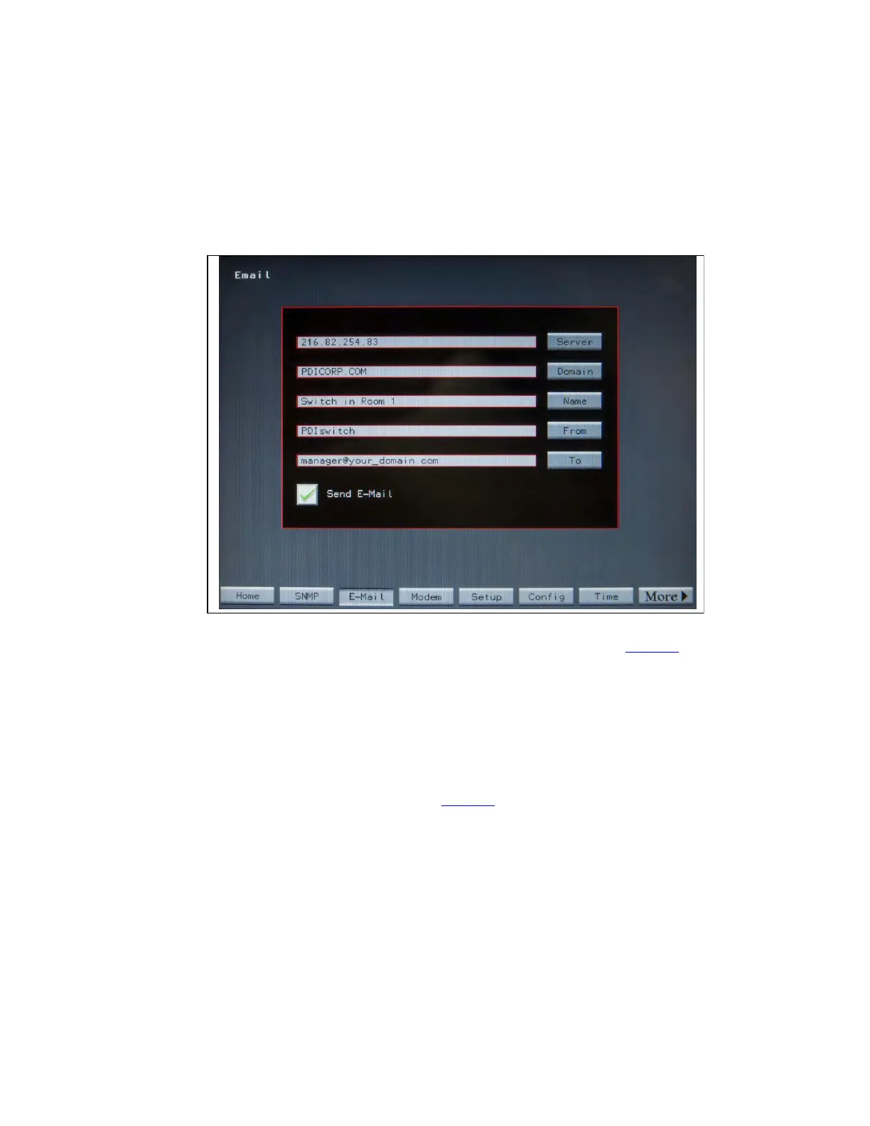 Touch the Email button on the navigation buttons to display the Email screen (Figure 26). Enter email Server,