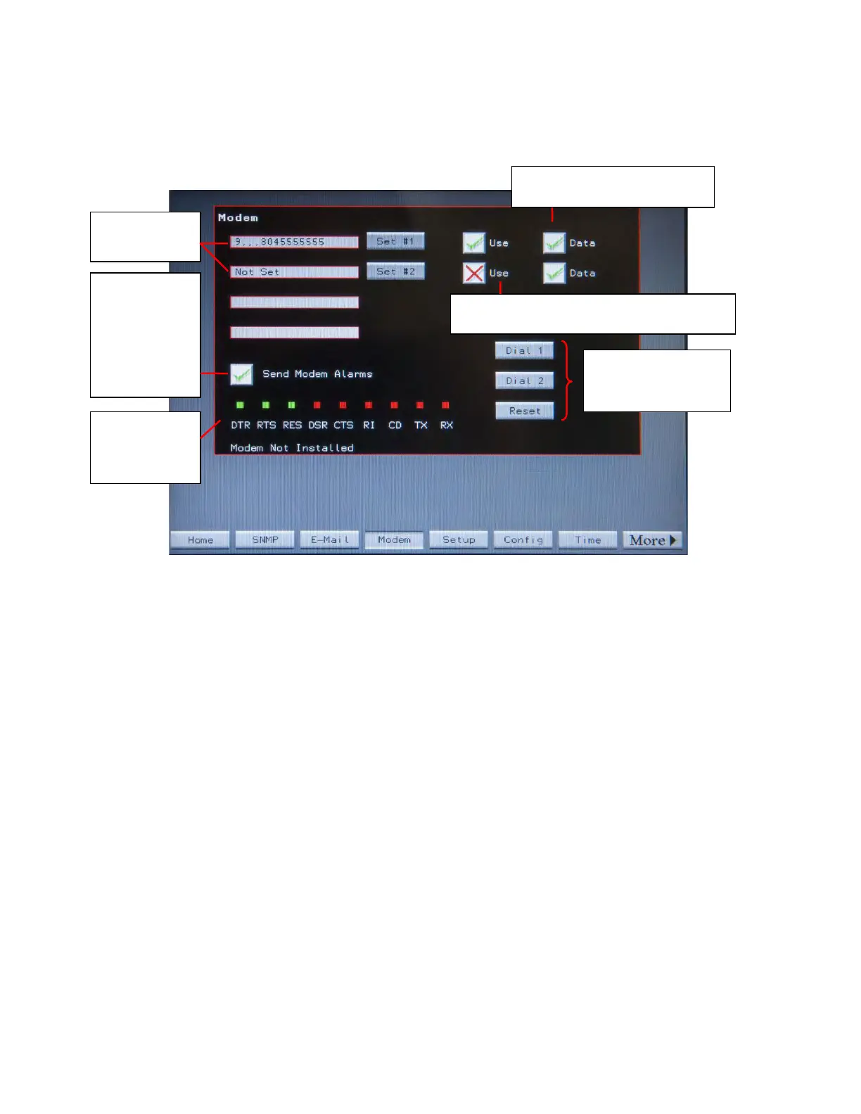 To test the modem dial out feature, touch Dial 1 or Dial 2 to force the modem to dial number 1 or 2.
