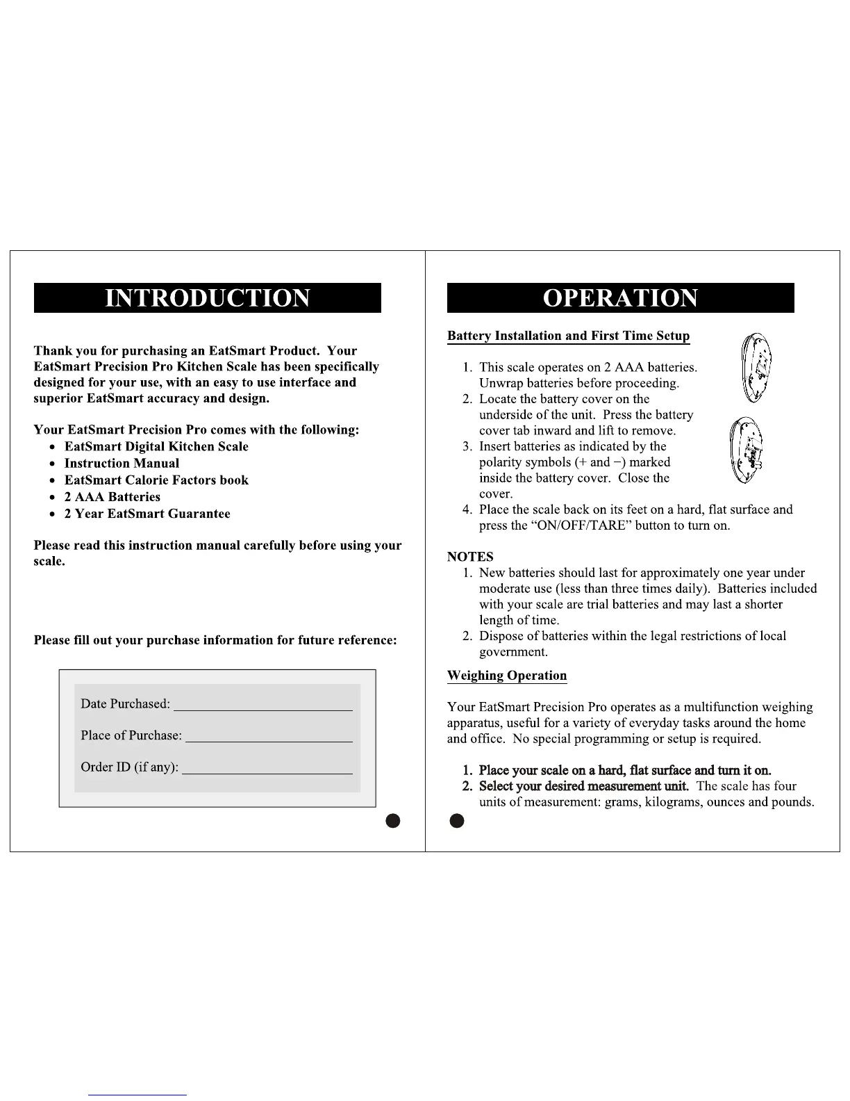 eatsmart Precision Pro - Introduction; Product Contents; Operation; Battery Installation and Setup