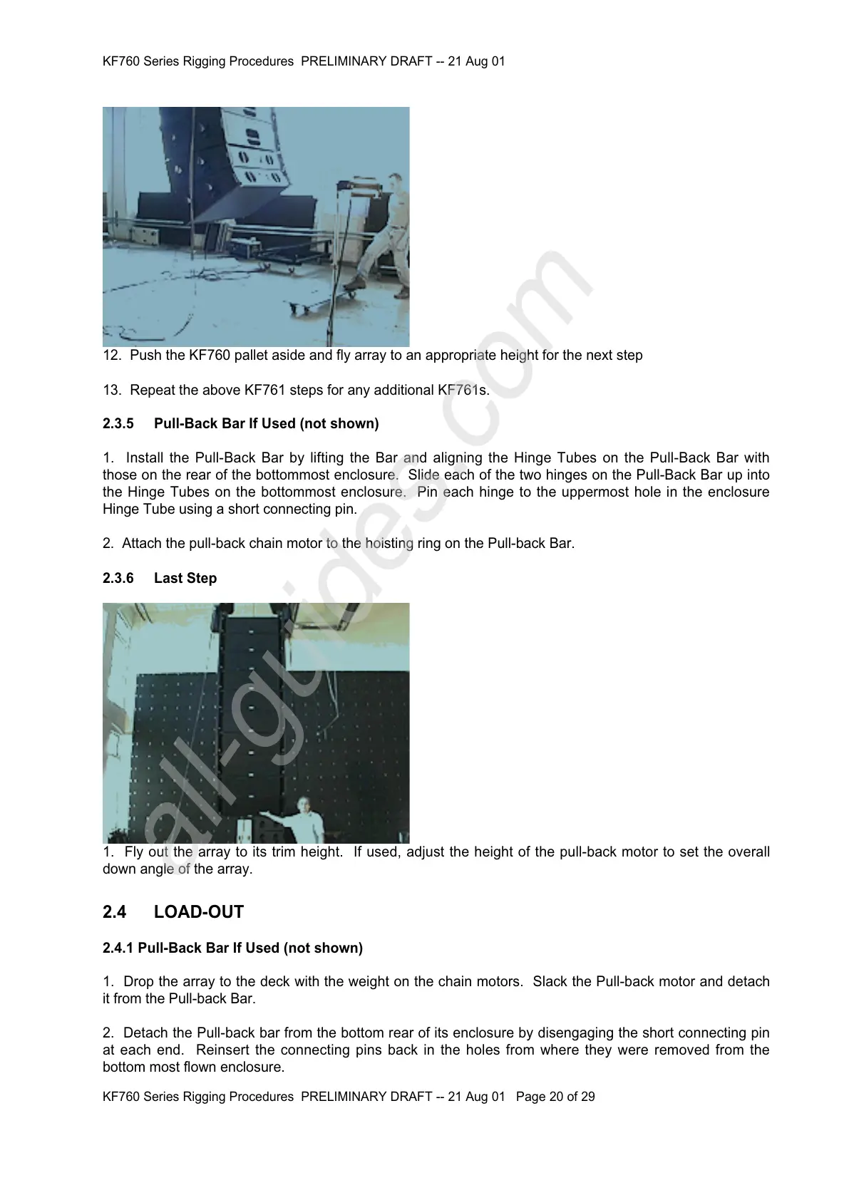 1. Drop the array to the deck with the weight on the chain motors. Slack the Pull-back motor and detach