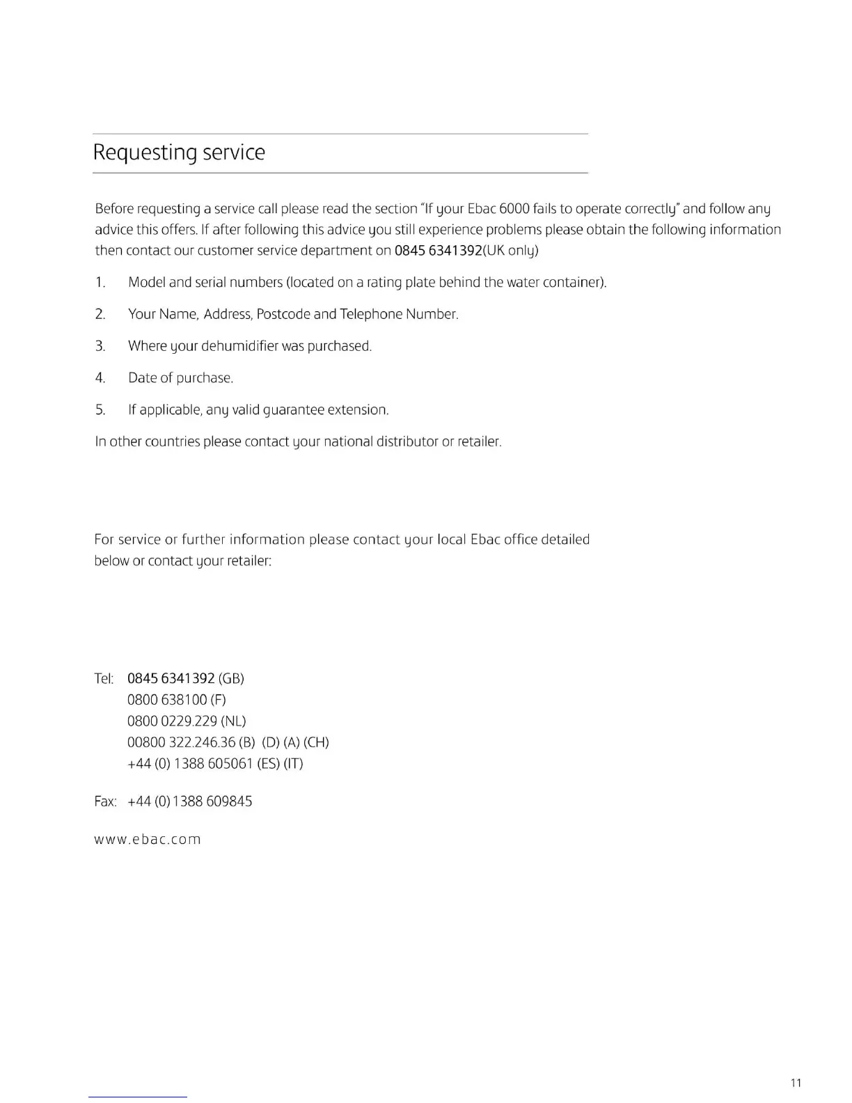 Ebac 6000 Series - Requesting Service; Contacting Customer Support