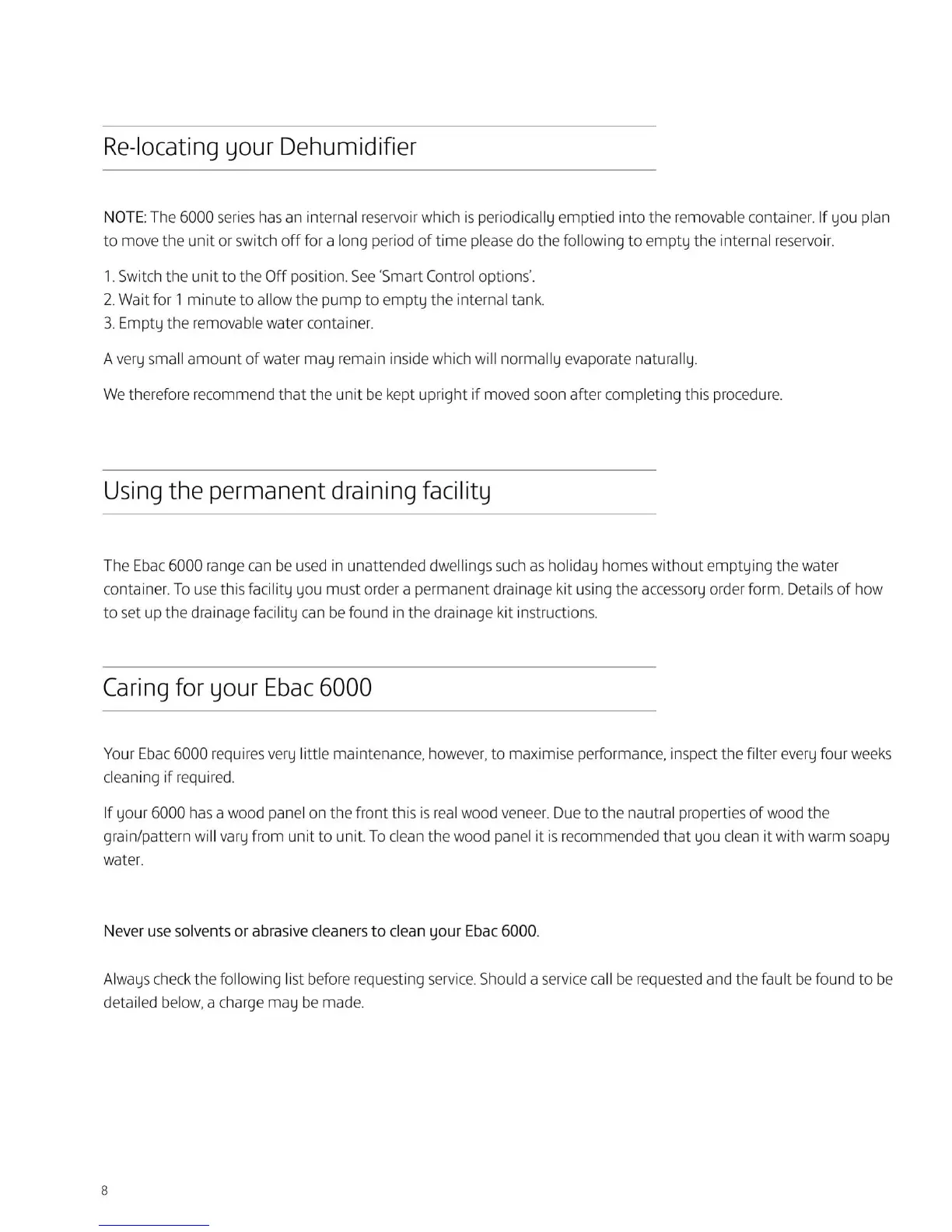 Ebac 6000 Series - Advanced Usage and Care; Re-locating Your Dehumidifier; Permanent Draining Facility; General Care and Cleaning
