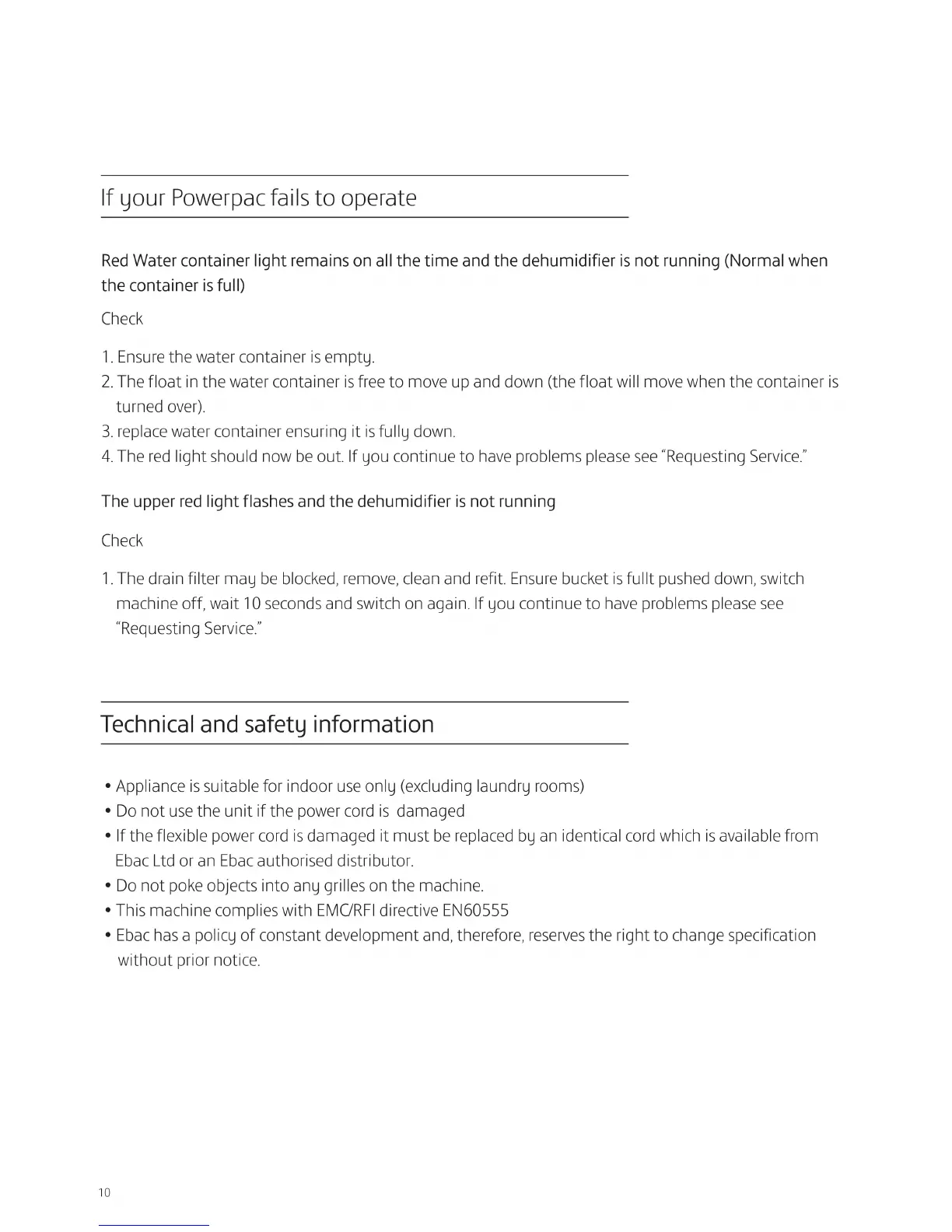 Ebac Powerpac - Advanced Troubleshooting and Safety; Red Water Container Light Issues; Flashing Red Light Errors; Technical and Safety Information