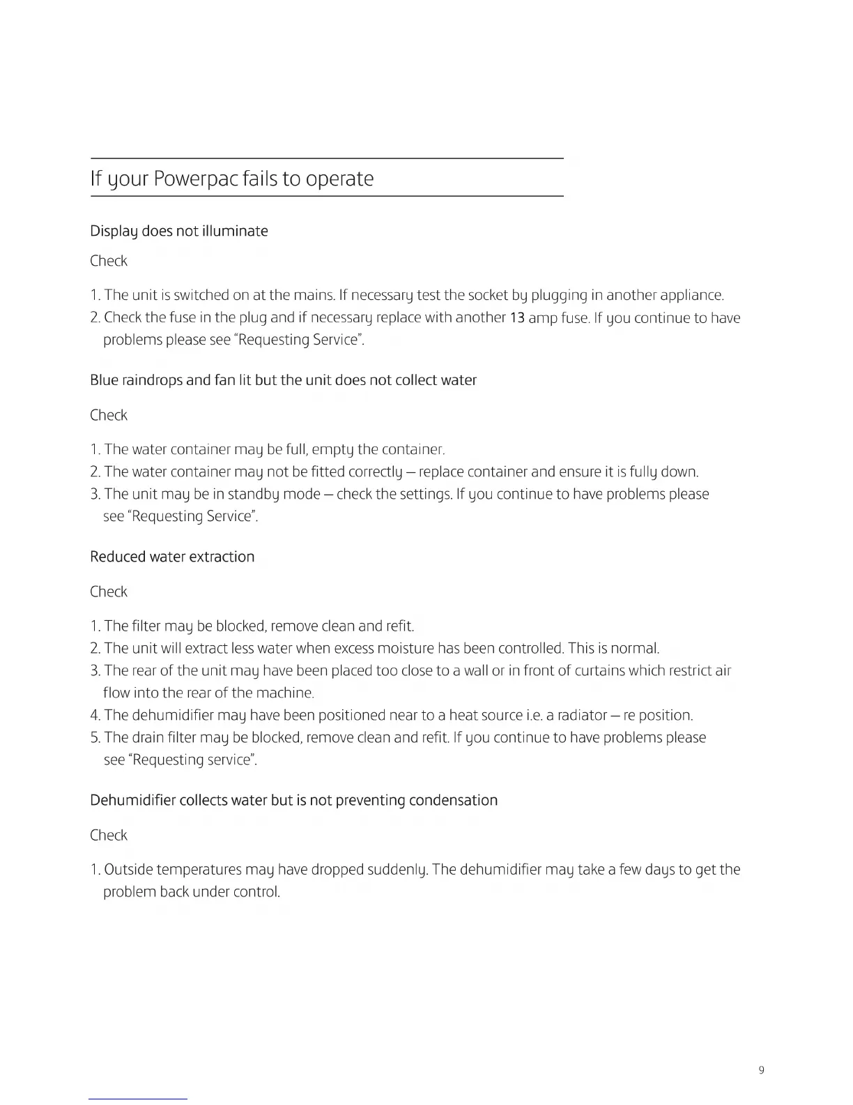 Ebac Powerpac - Troubleshooting Common Issues; Display Not Illuminating; No Water Collection; Reduced Water Extraction