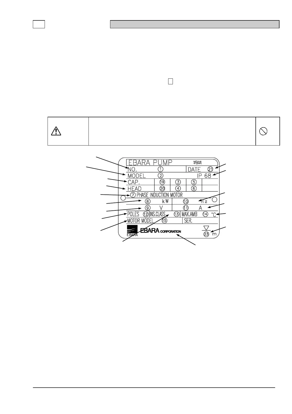 1) The nameplate gives basic specification of the pump. Confirm the specification of your pump on the