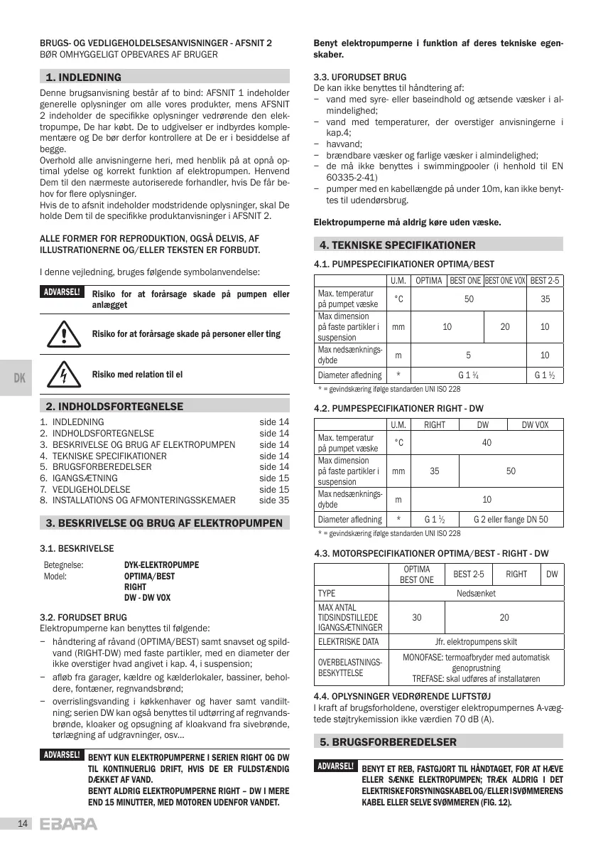 3. BESKRIVELSE OG BRUG AF ELEKTROPUMPEN side 14
