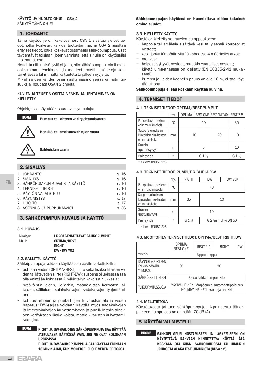 4.1. TEKNISET TIEDOT: OPTIMA/BEST-PUMPUT