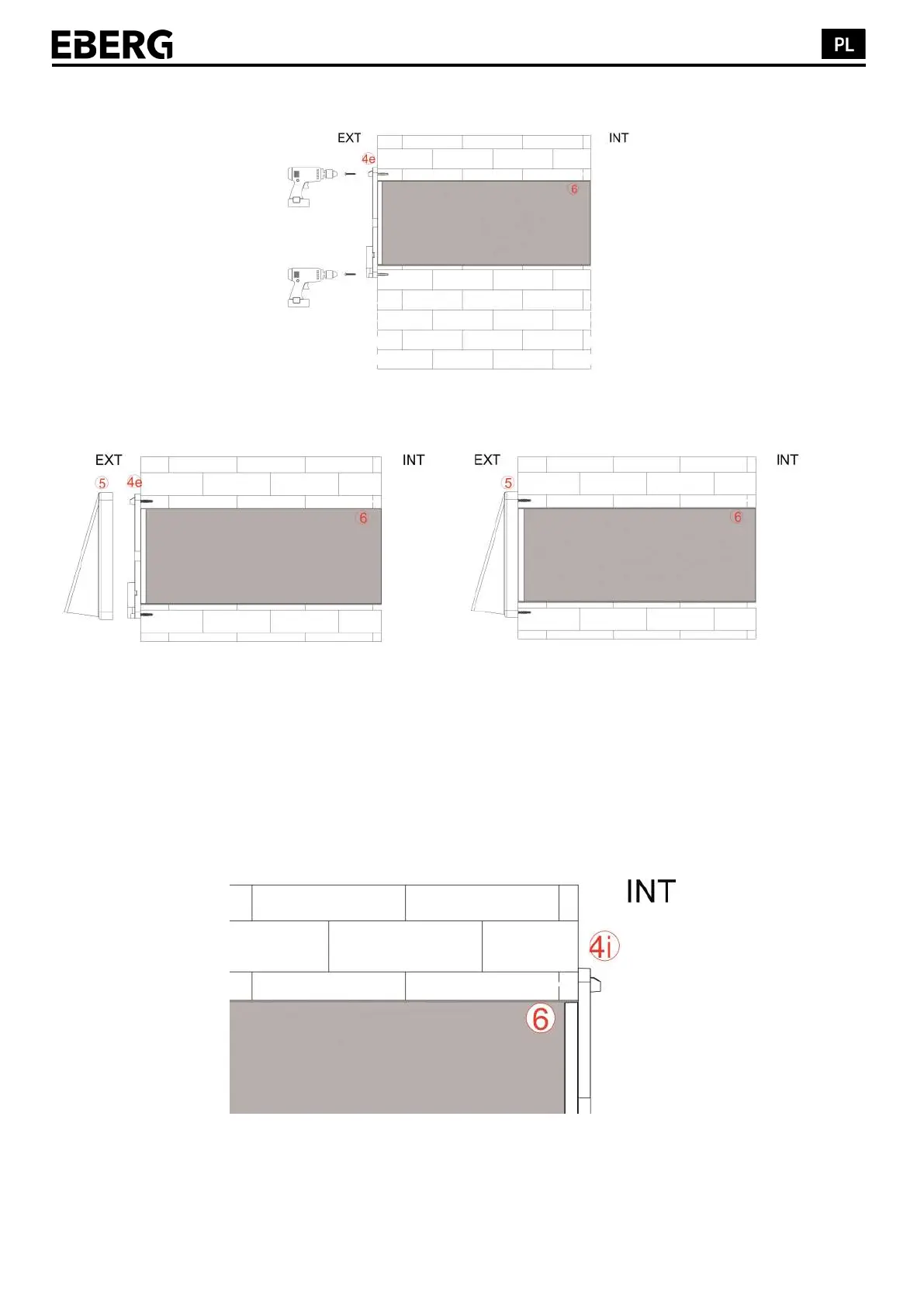 Zamontuj płytę montażową wewnętrzną (4i) w kanale (6) po wewnętrznej stronie ściany, jak pokazano na rysunku