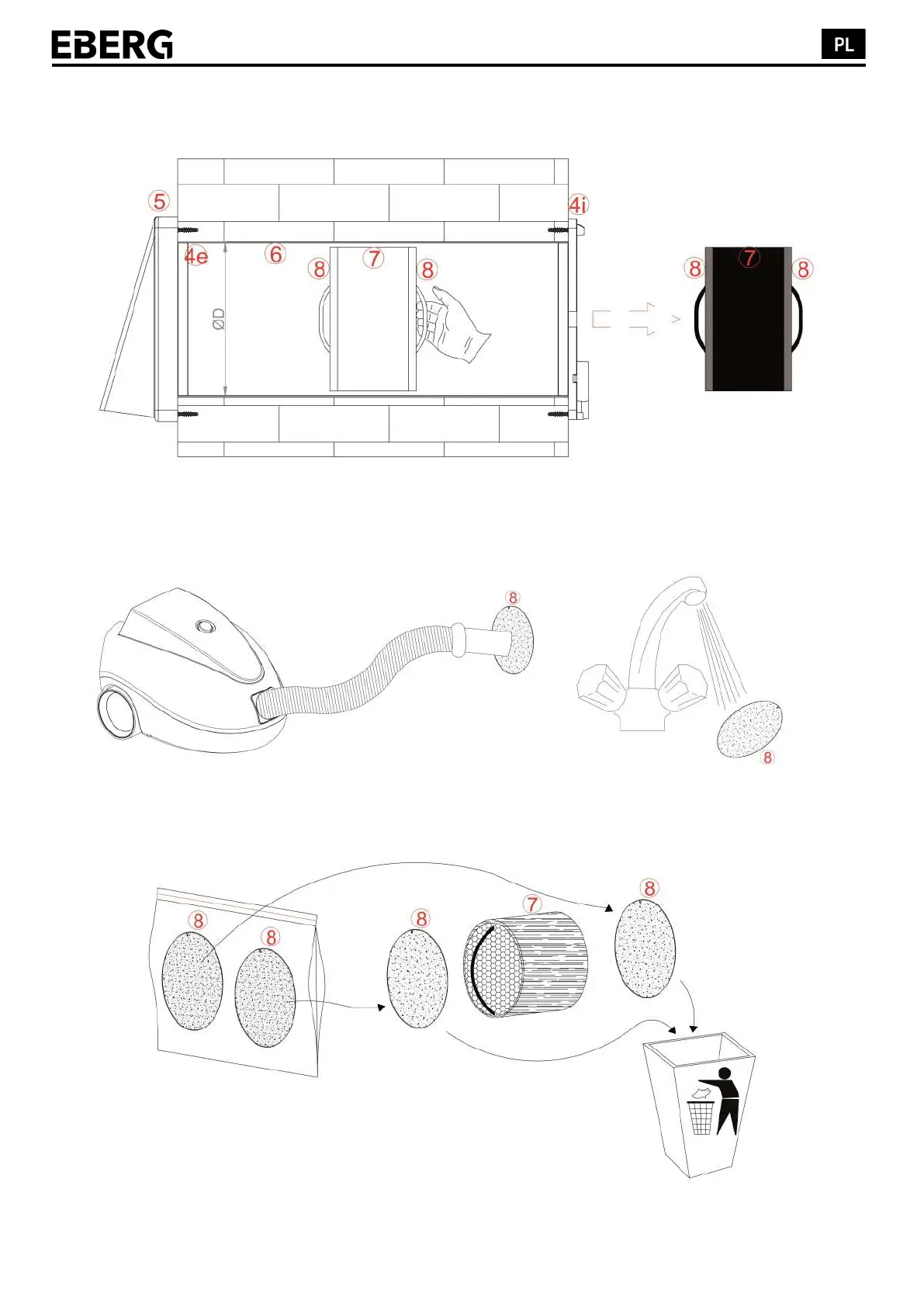 Odczep filtry (8), a następnie wyczyść je przy pomocy odkurzacza. Możliwe jest też mycie pod bieżącą wodą.