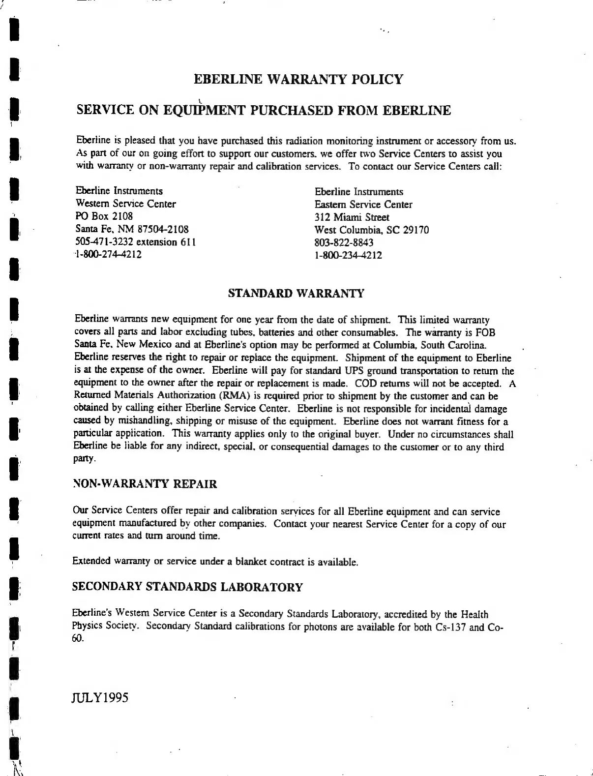 Eberline RO-2 - Eberline Warranty Policy and Service Information; Service Centers and Contact Information; Standard Warranty Coverage; Non-Warranty Repair and Extended Service