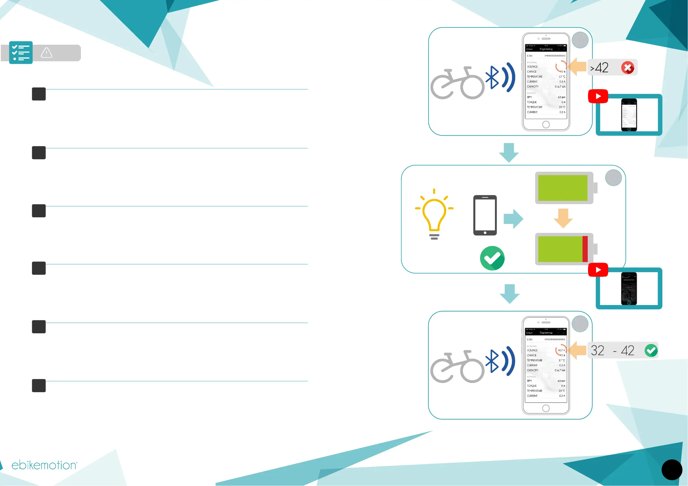 1. Connecter le vélo à la Dealer APP et vérifier que la tension de la batterie se situe dans la plage