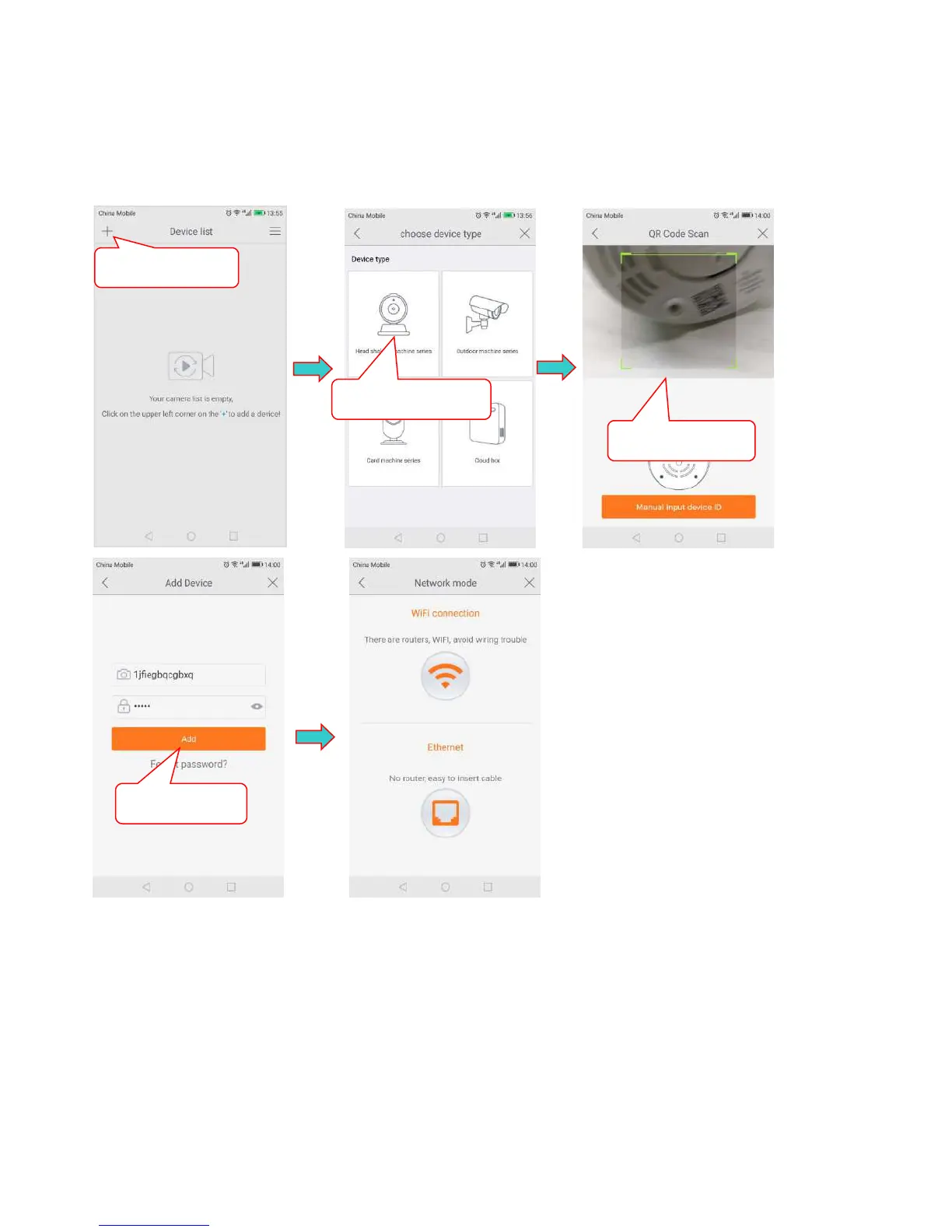 Click on '+' in top left corner, select the device model, scan the QR code and add the device ID, and