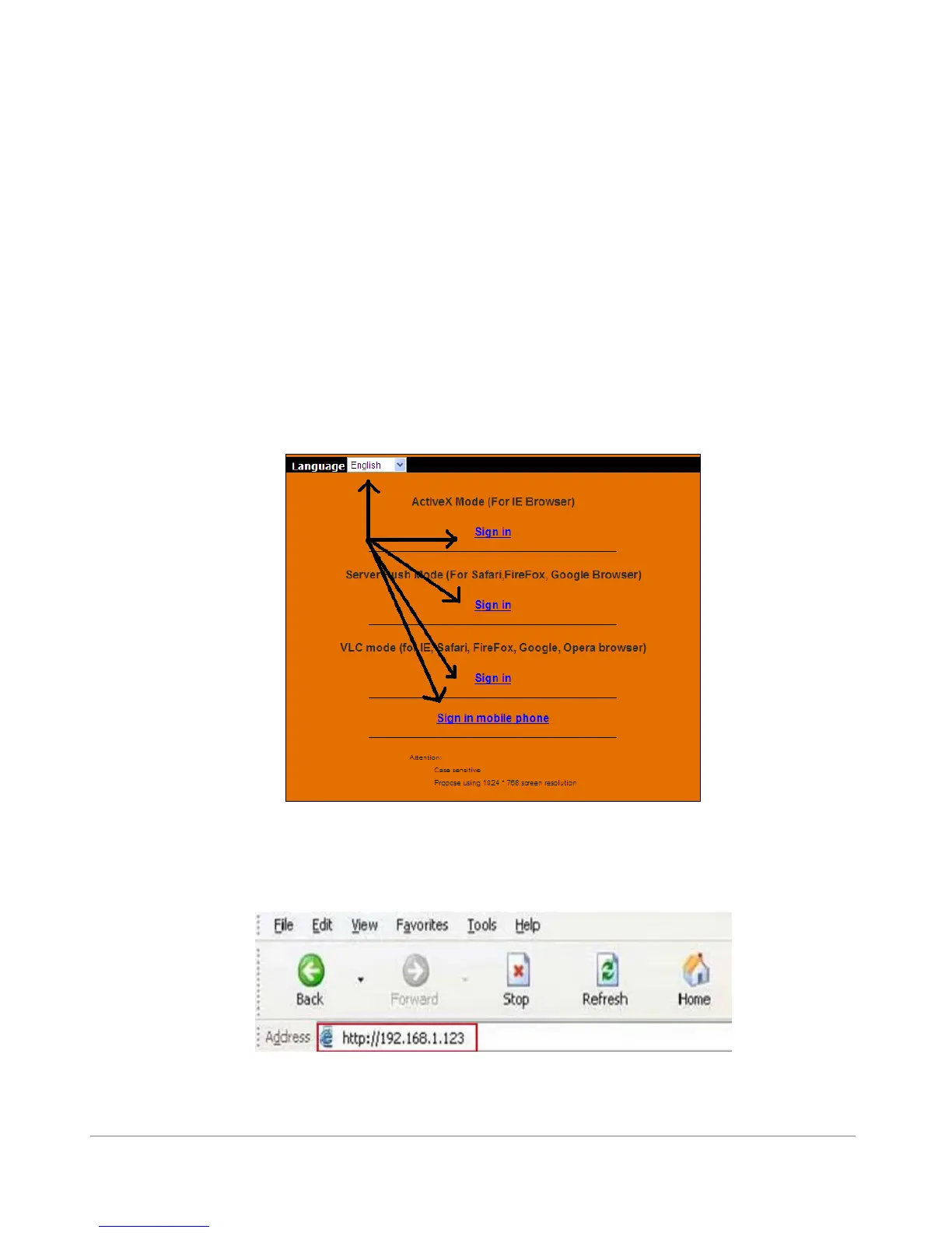 To access the camera by IE Browser directly, just type the camera’s IP address, You will find the address of your camera