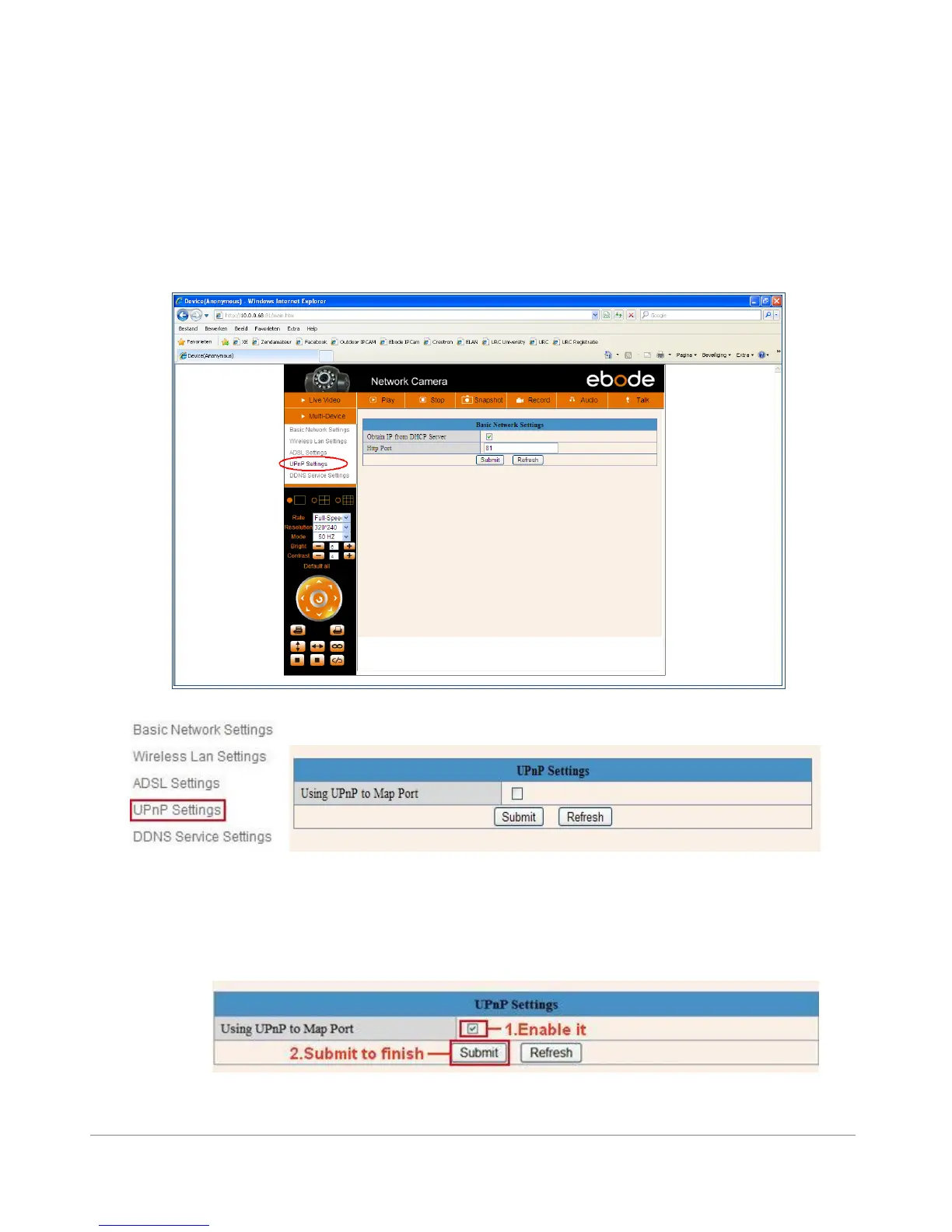 Select UPnP and click Submit, then the camera will support UPnP port forwarding automatically. It is helpful for using