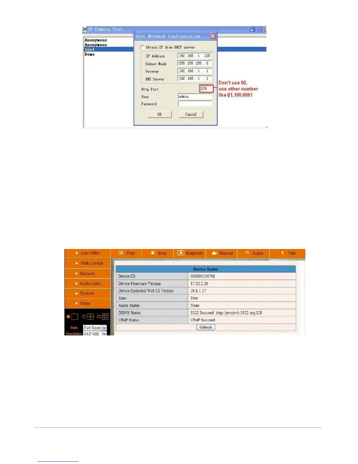 camera and choose “System”>”Device Info”. Please check that ‘DDNS Status’ shows ‘succeed’ followed by the address.