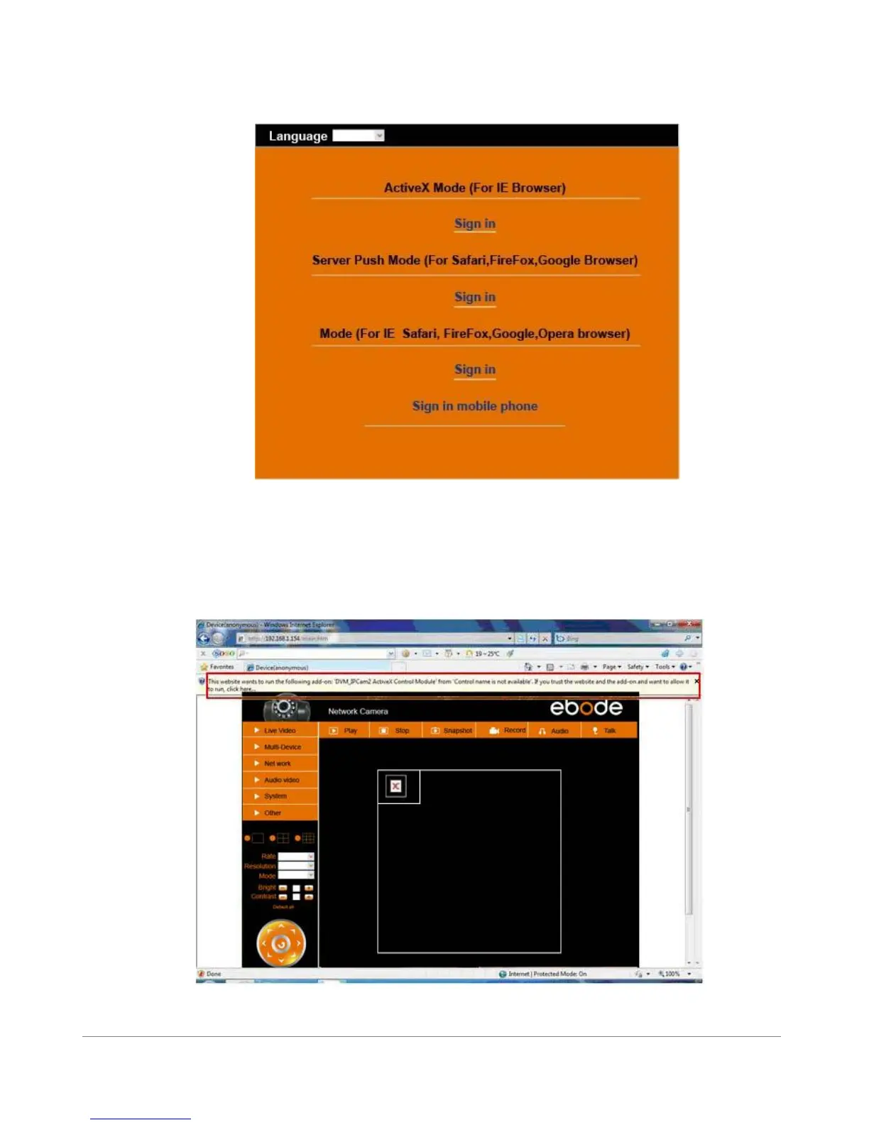 Choisissez ActiveX Mode (For IE Browser), et connectez-vous.