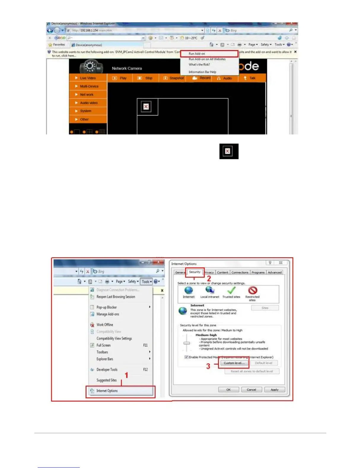 Note: Si après avoir accepté l’activeX vous n’avez toujours pas accès à la vidéo, (page noire et croix rouge), ou juste
