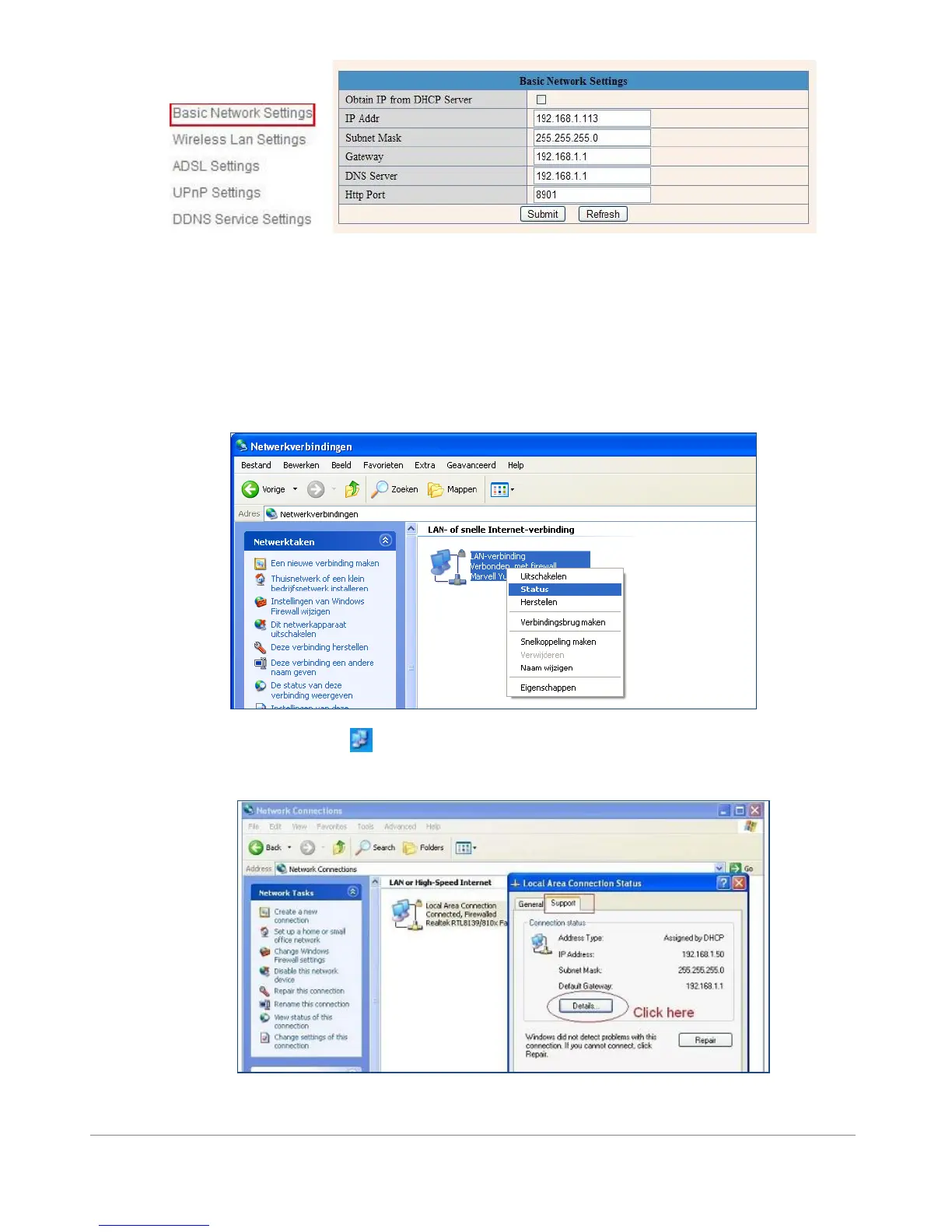 Si vous ne connaissez pas le “Subnet Mask”, Gateway, DNS Server. Merci de regarder le statut de connexion local de votre