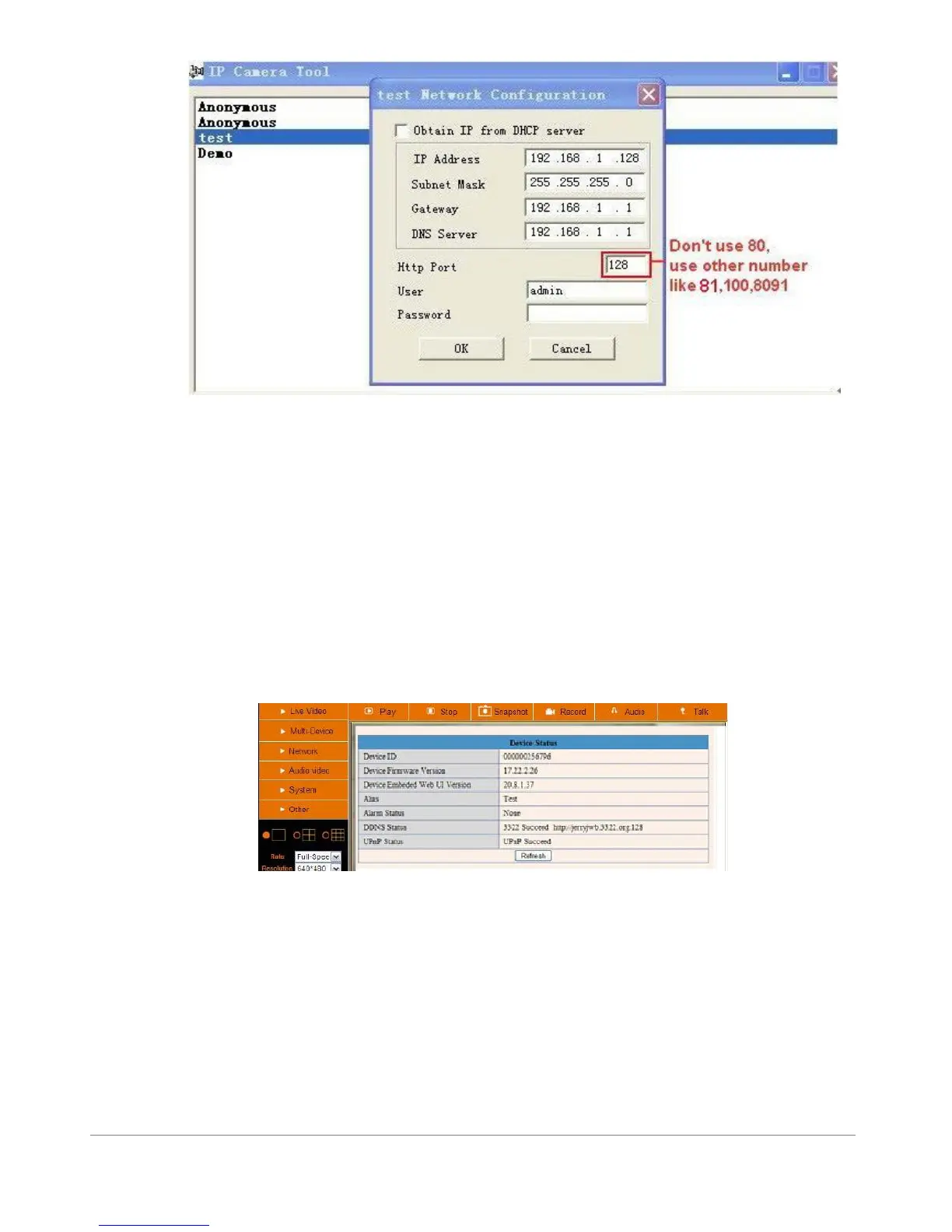 la caméra et choisissez “System”>”Device Info”. Merci de vérifier que le ‘DDNS Status’ soit en ‘succeed’ suivi de