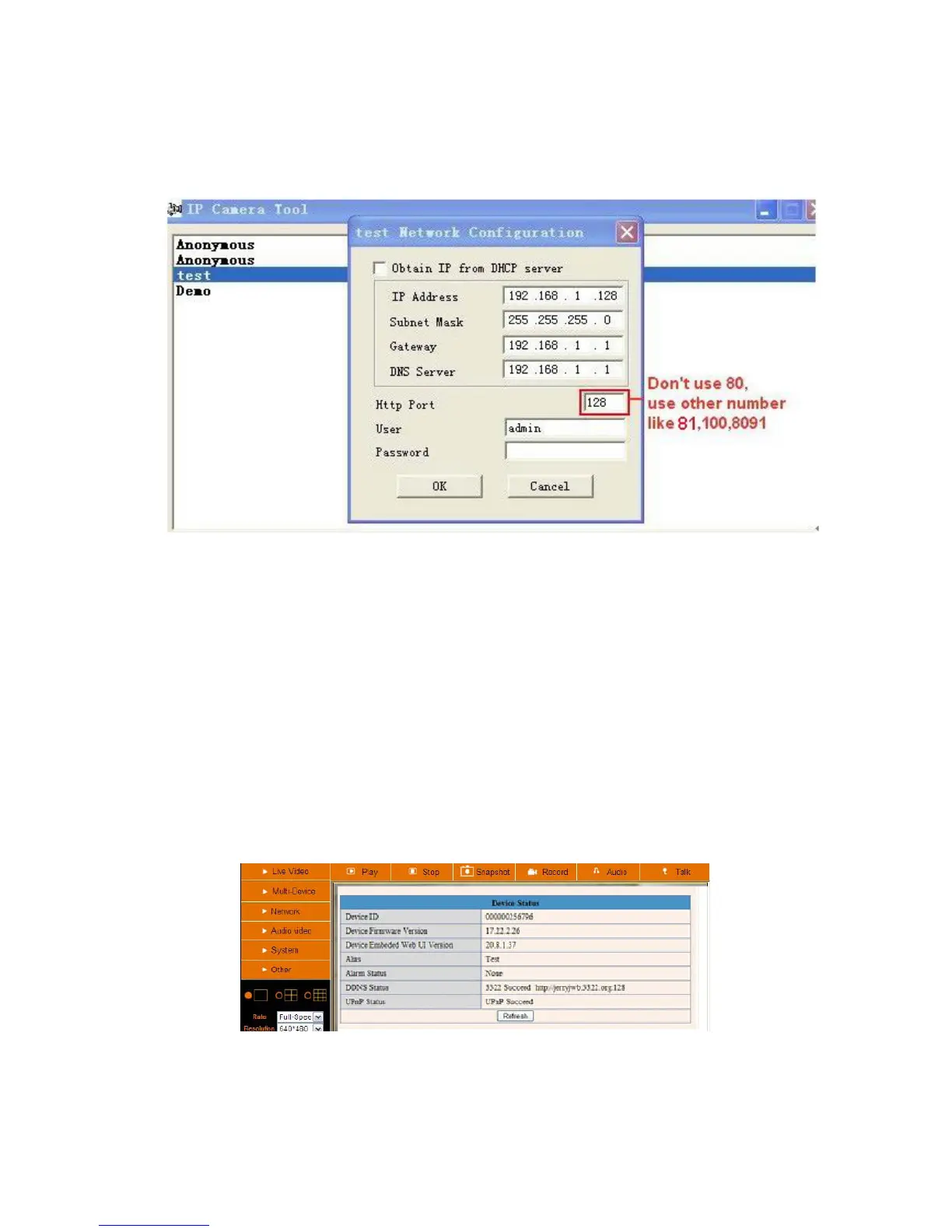 click and choose network configuration. The default port of camera is “80”, please change “80” to any