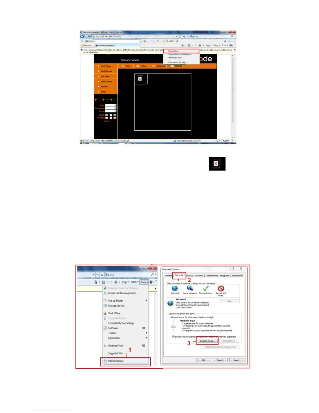 Note: If there is still no live video after you run ActiveX, and a red cross shows in the center of the
