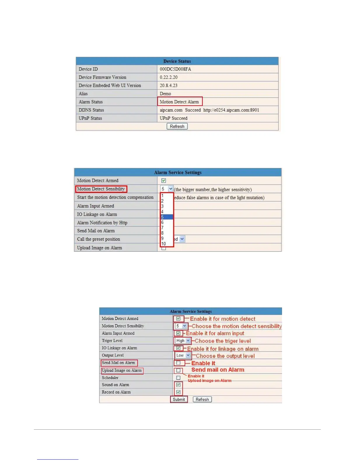 After you enable motion detect armed, if there is motion detected, the Alarm Status will turn to Motion