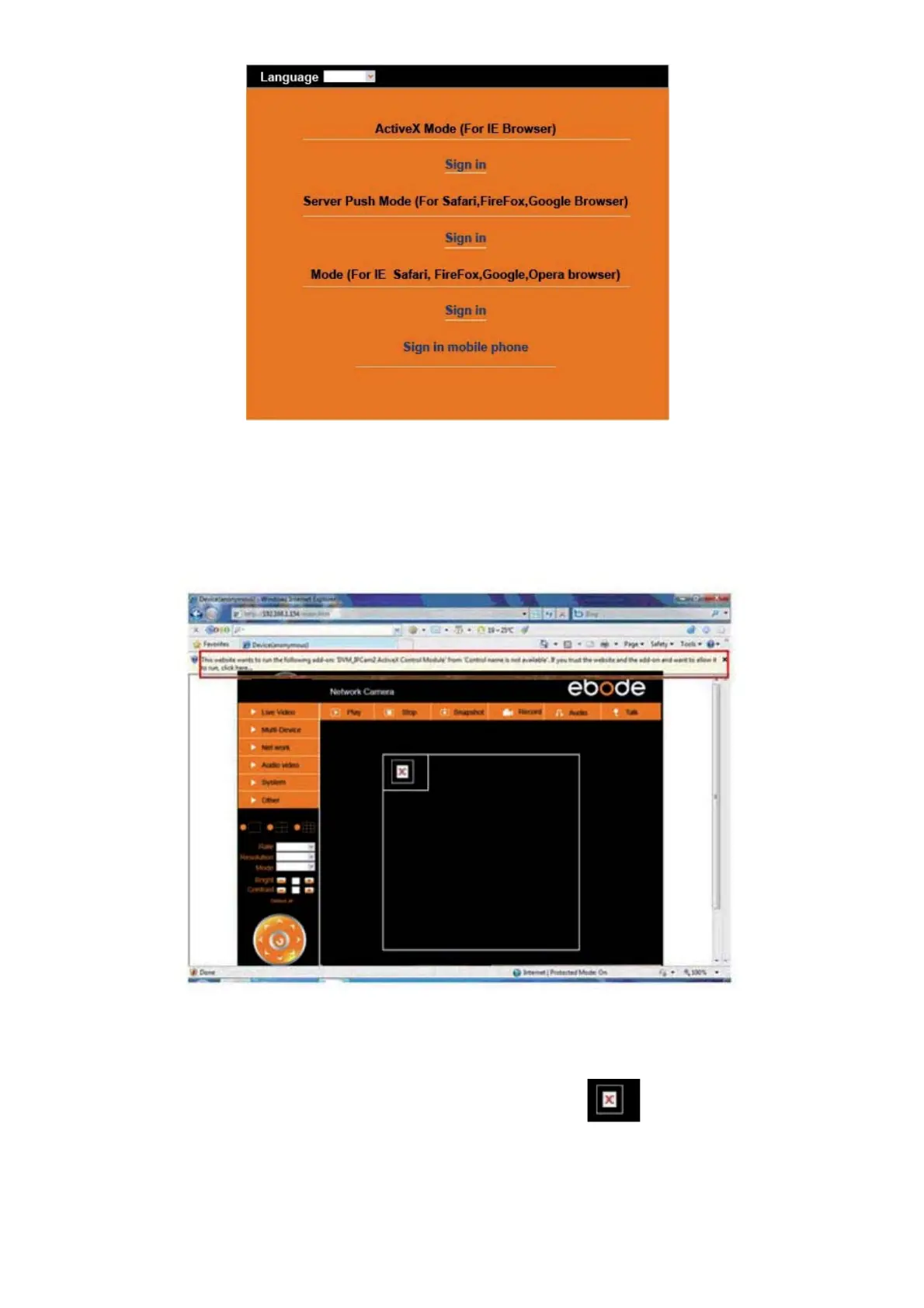 Note: If there is still no live video after you run ActiveX, and a red cross