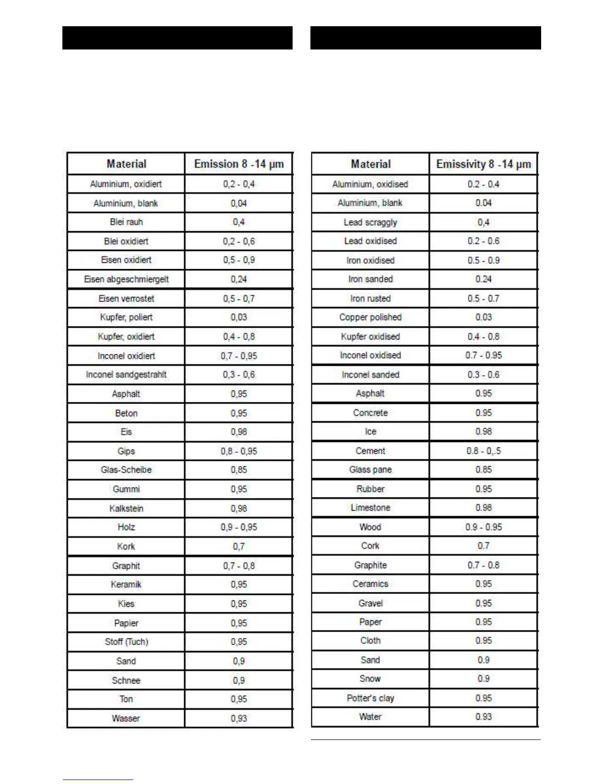 Ebro TLC 730 - Tabelle einiger Bekannter Emissionsgrade