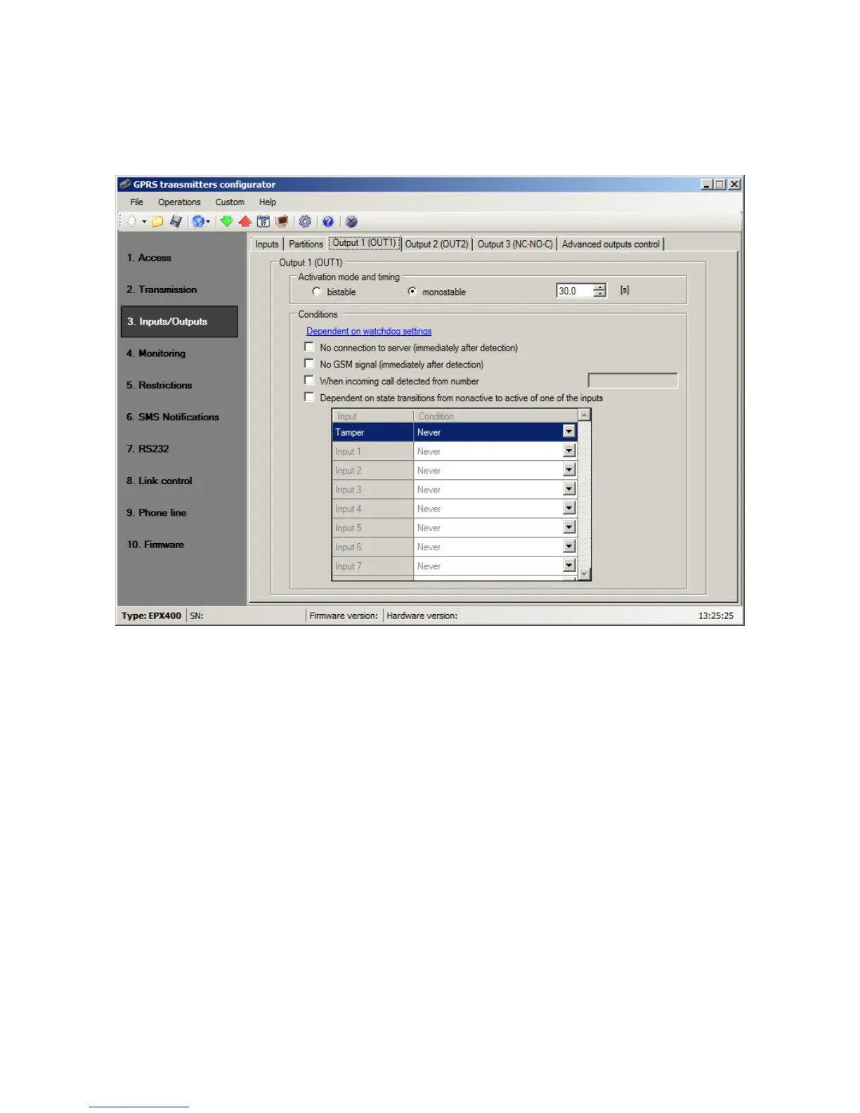 Tabs "Output 1 (OUT1)", "Output 2 (OUT2)" and "Output 3 (NC-NO-C)" define the