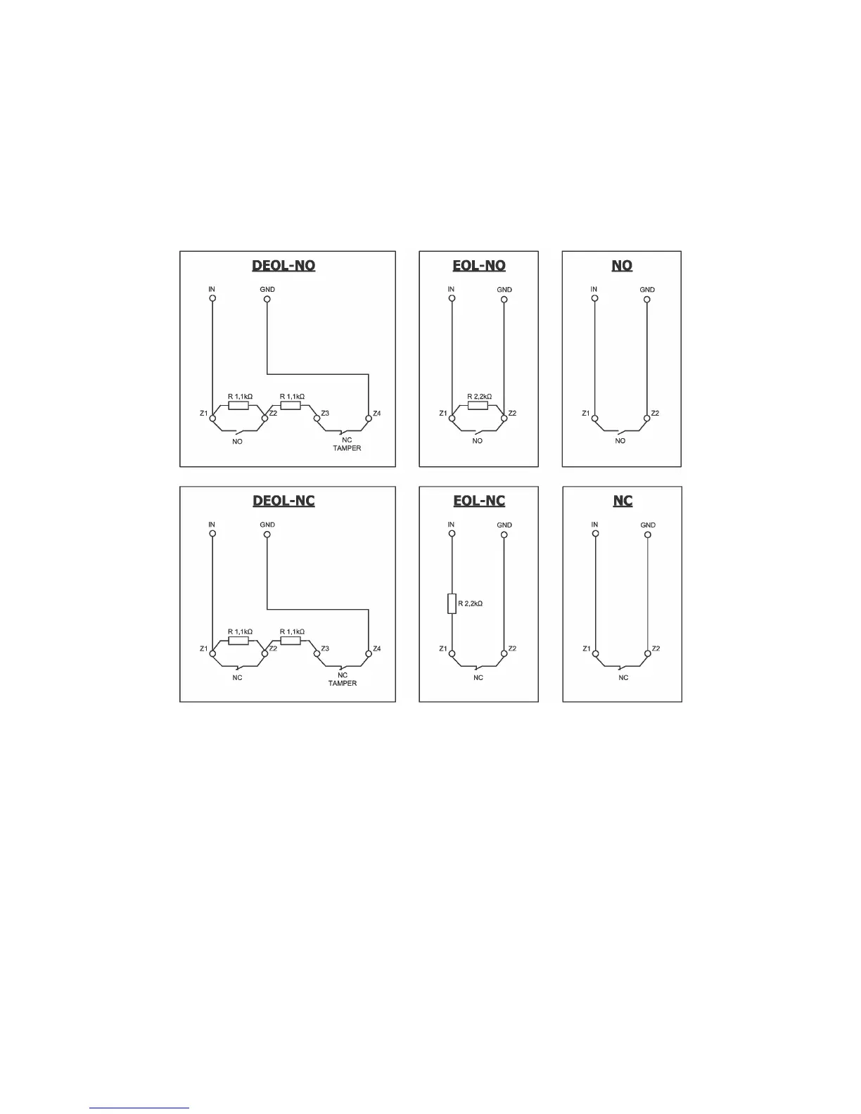 with resistors 2.2kΩ or as double end-of-line (DEOL-NO or DEOL-NC) with resistor