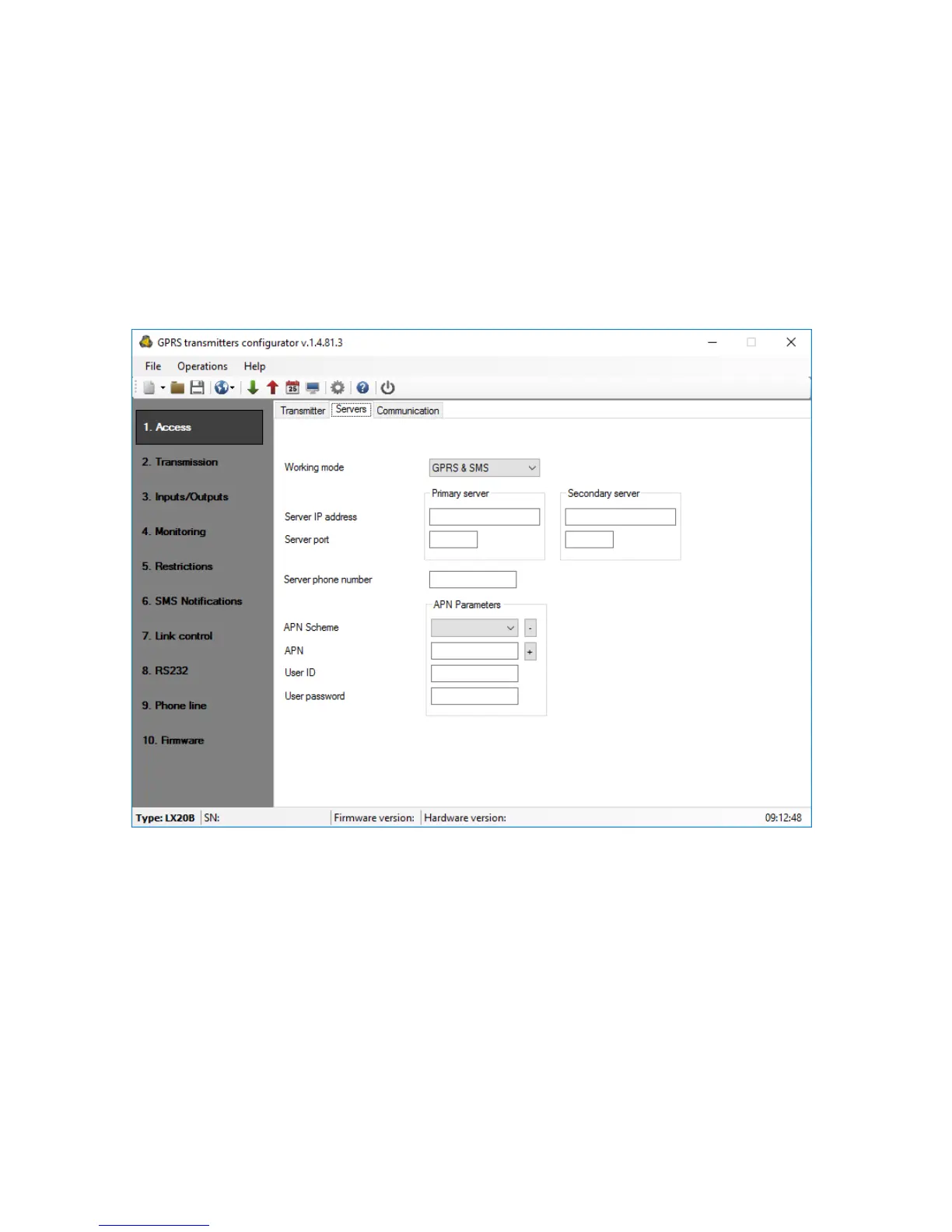 In case of the LX20B which has one slot for the SIM card, Server tab is as follows: