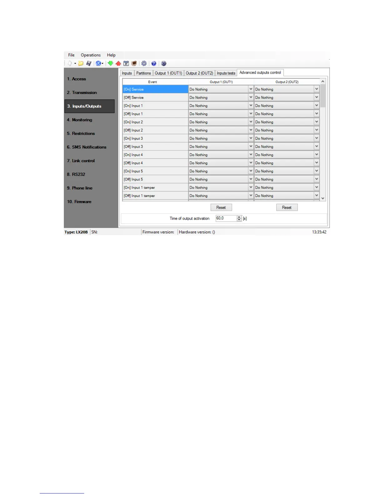 Press the [Reset] button to assign the action “Do Nothing” for each event.