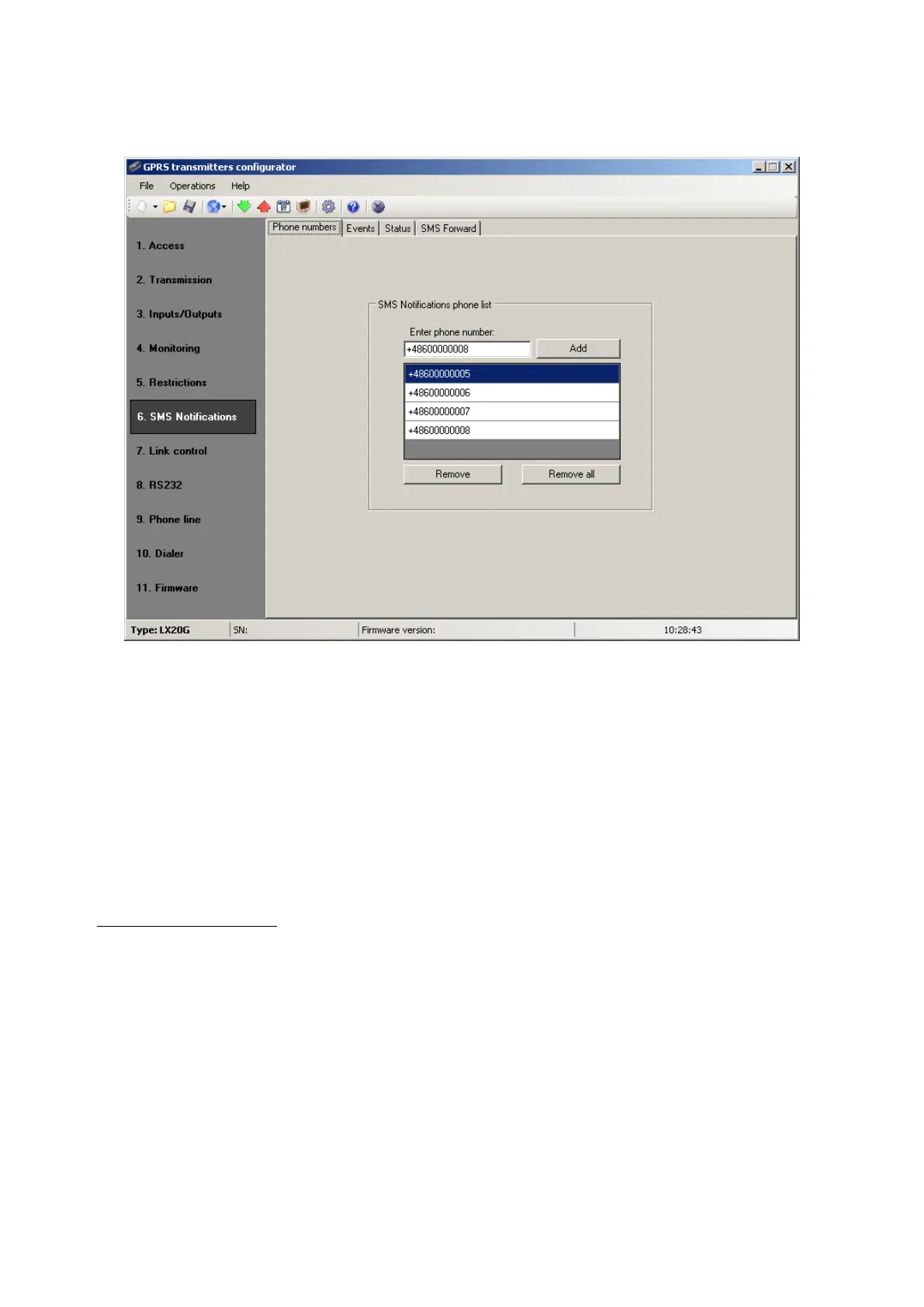 This tab is to configure and edit SMS messages to be sent to listed phone numbers.