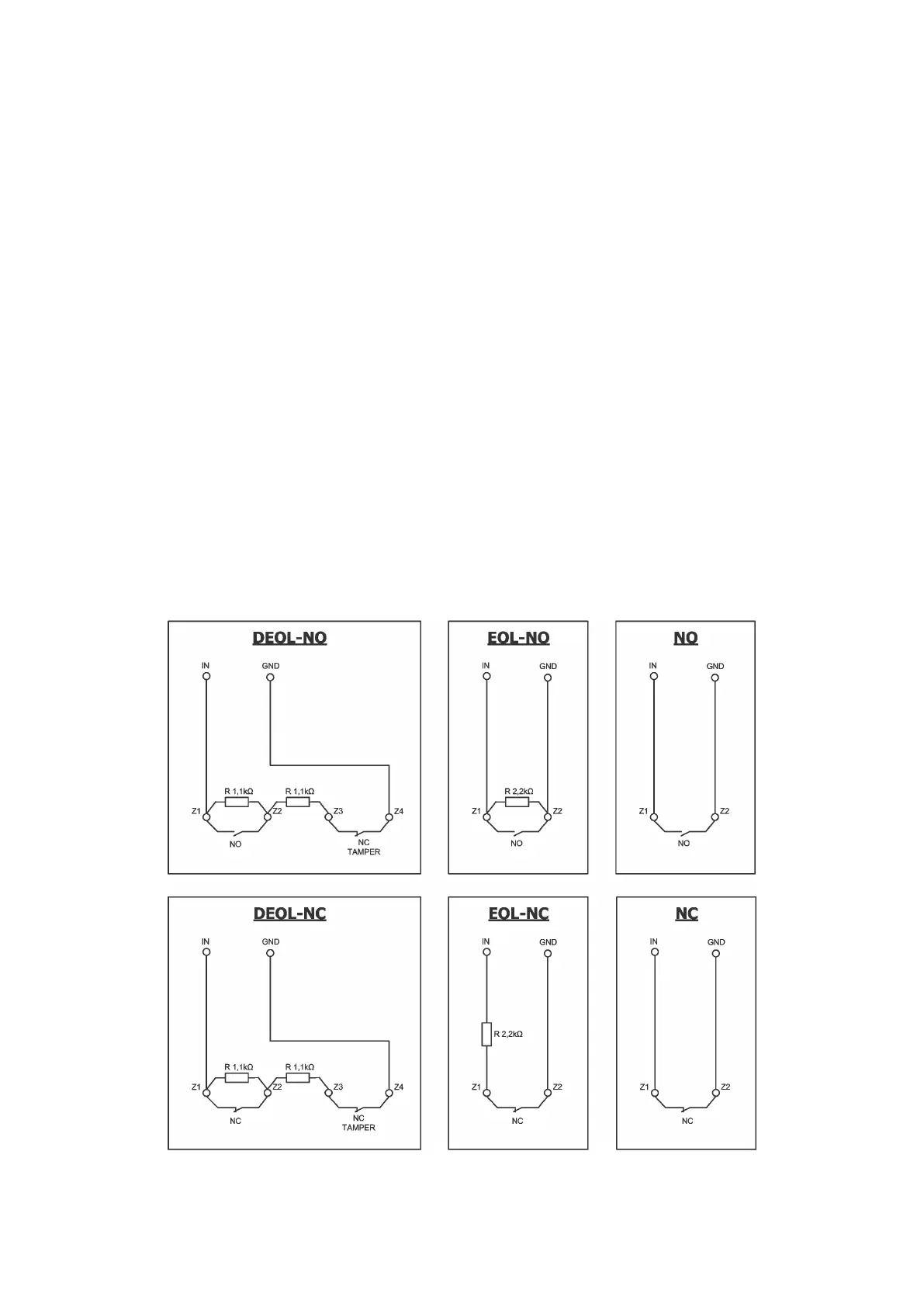 resistors 2,2kΩ or as double end of line (DEOL-NO or DEOL-NC) with resistor 1,1kΩ.