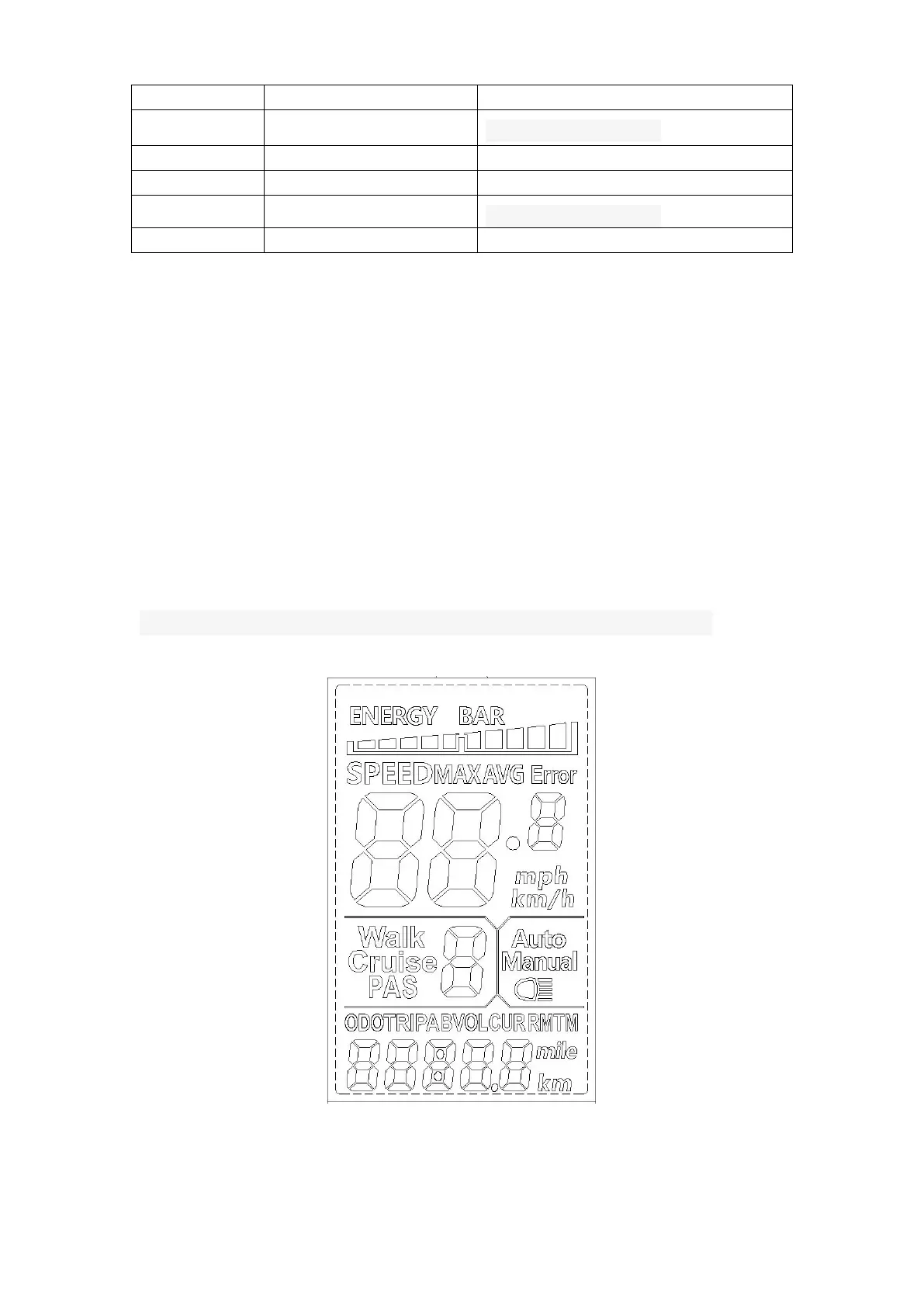 Speed display, power level display, power indicator, failure warning, total mileage, single
