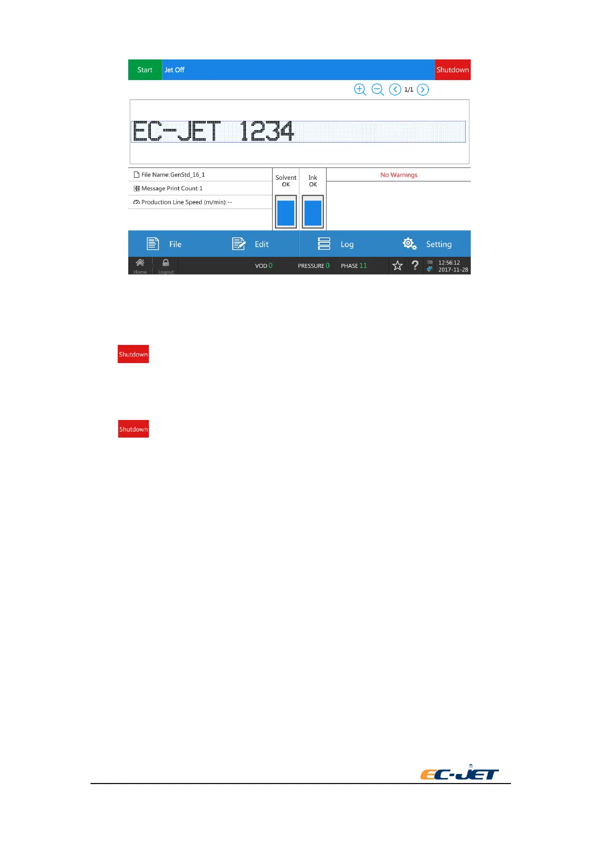 The current condition can be seen in Home, including the jetting status, ink/solvent level and
