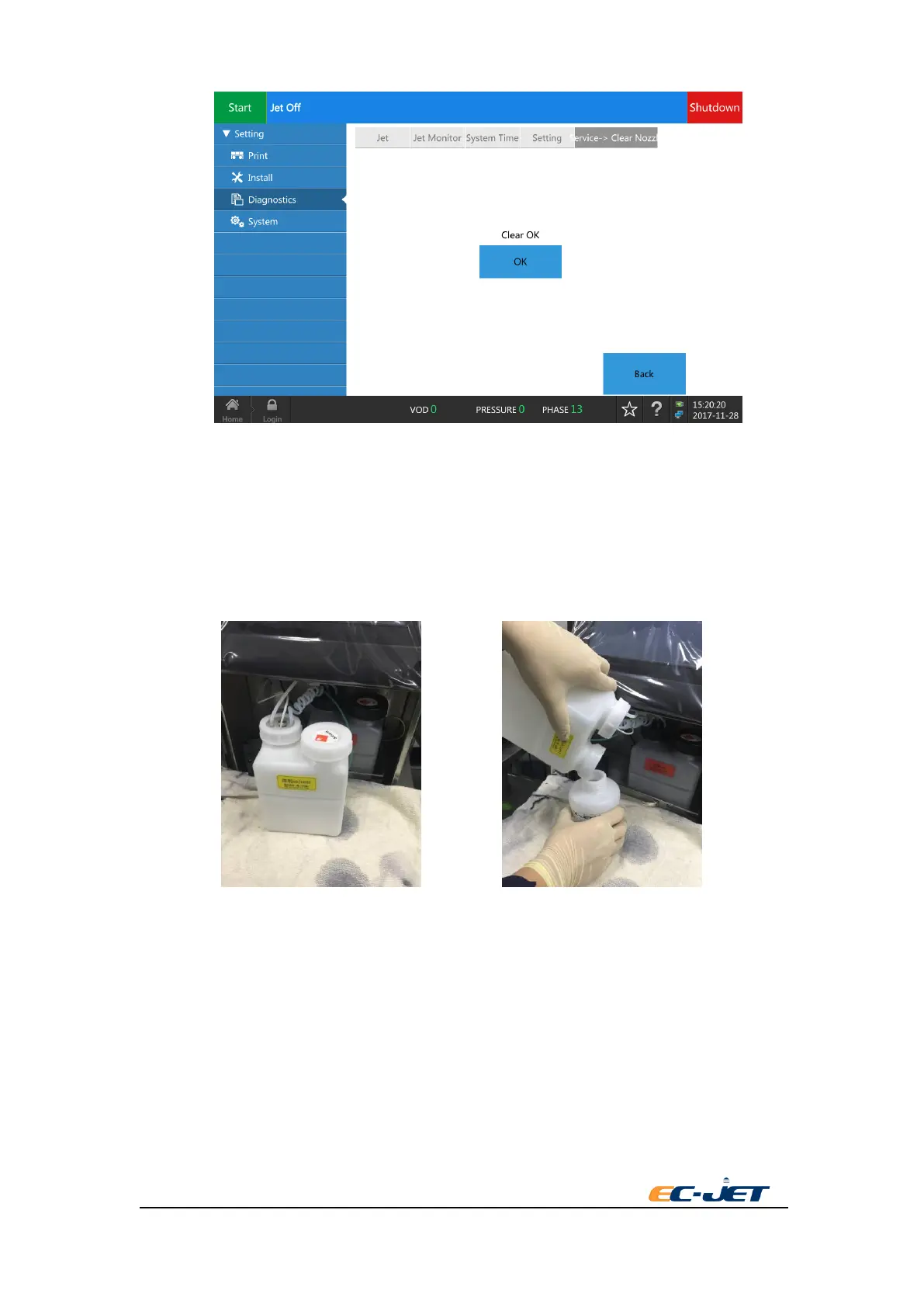 2 Enter the interface of diagnosis. Press the button of clean printer. Select to empty the main filter