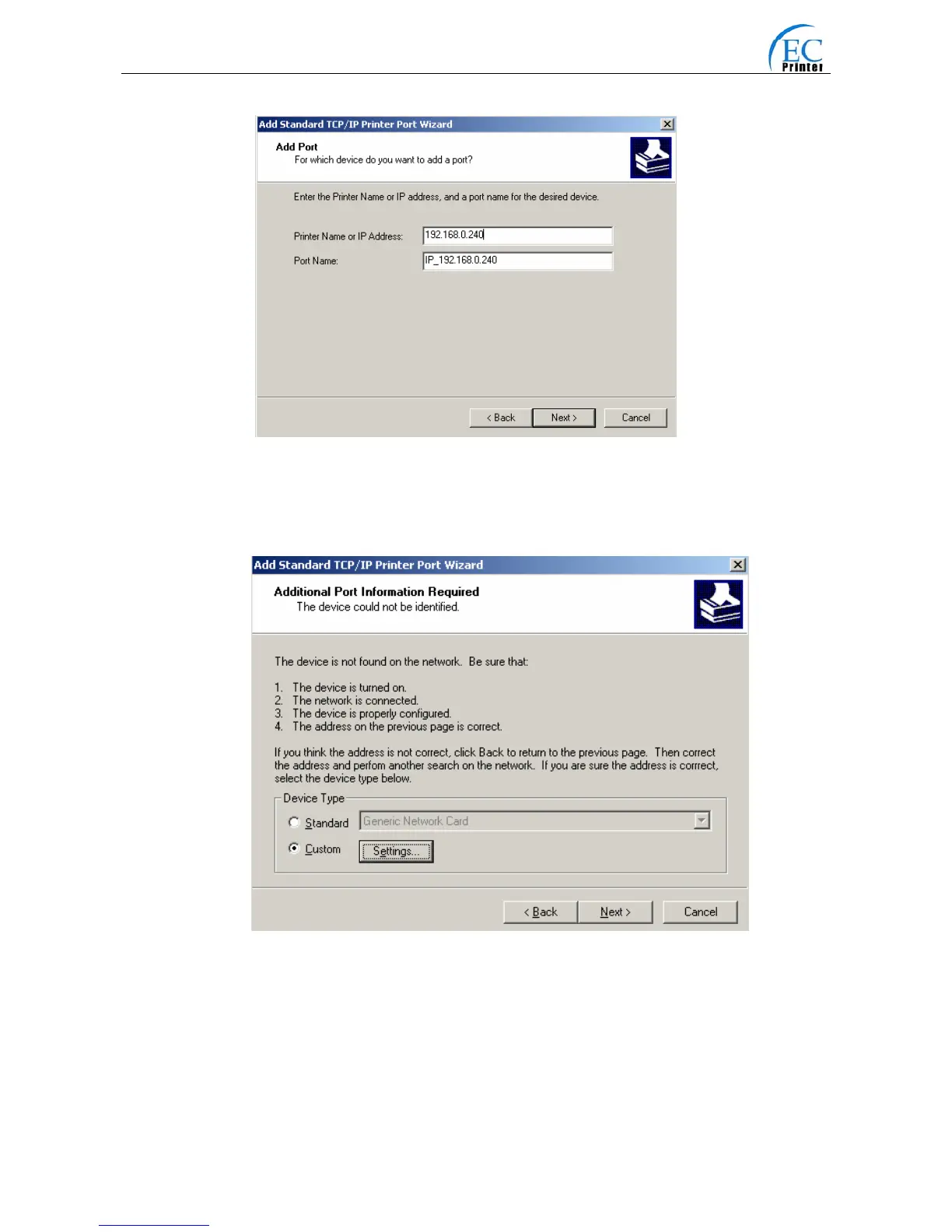 8) Come out a window of “Port Settings”. Affirm that “Port name” and “Printer name or IP