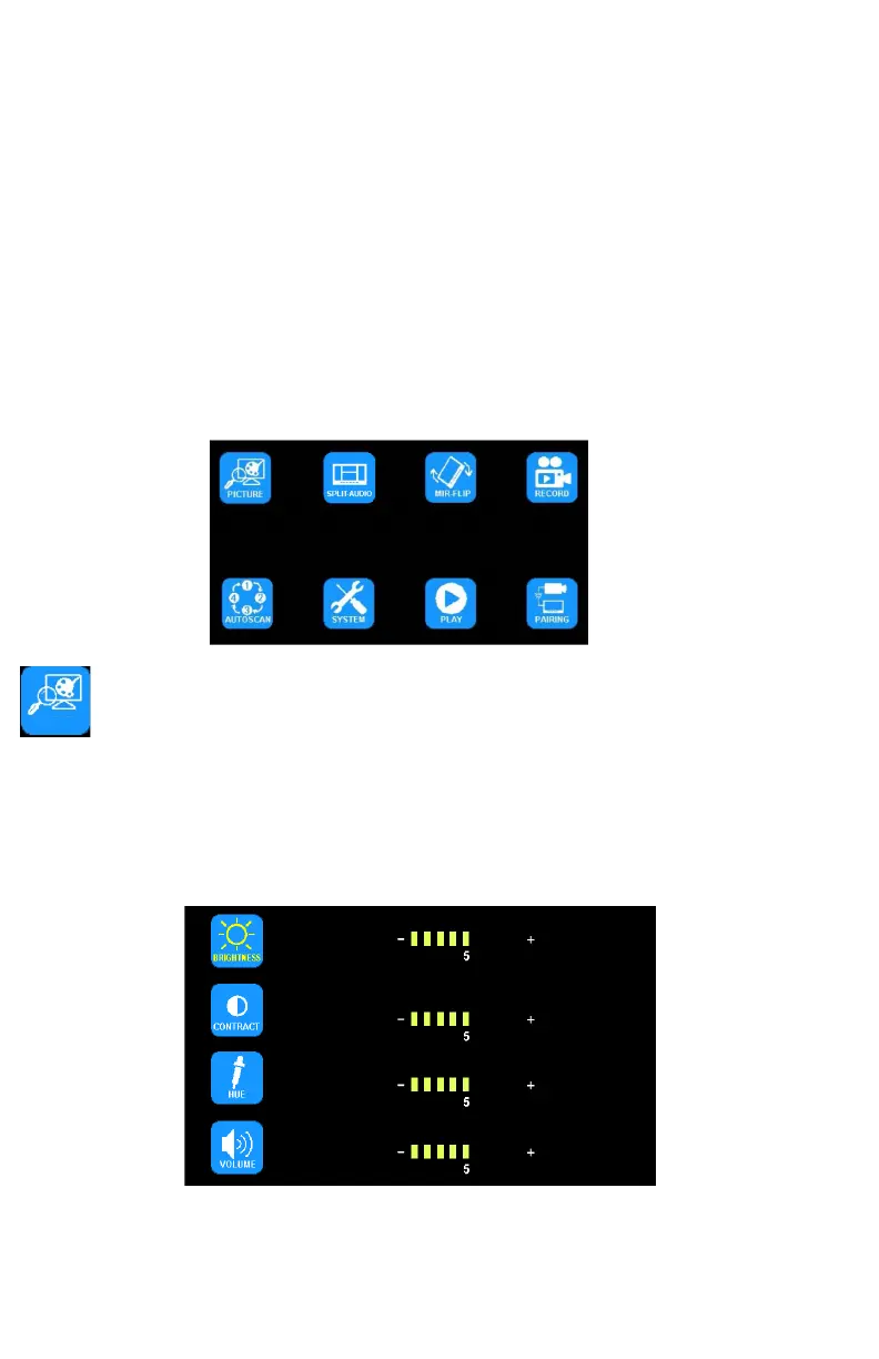 corriente al cable amarillo de activación, y presione el botón + o – en el monitor (< o > en el control remoto) para pasar por todas las vistas de cámaras divididas.